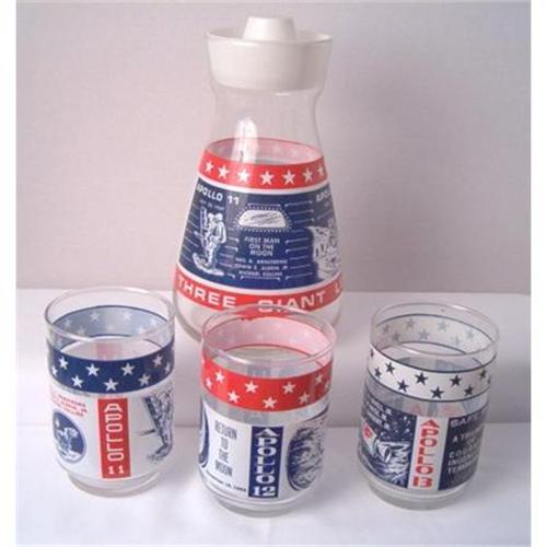 Apollo pitcher & glasses for all three missions- Apollo 11, 12 & 13. The pitcher has the legend for all three missions, the glasses are individually marked and there are three for each mission. There are no chips or cracks...Order three of anything that we can ship in one container, pay with PayPal and shipping is FREE...