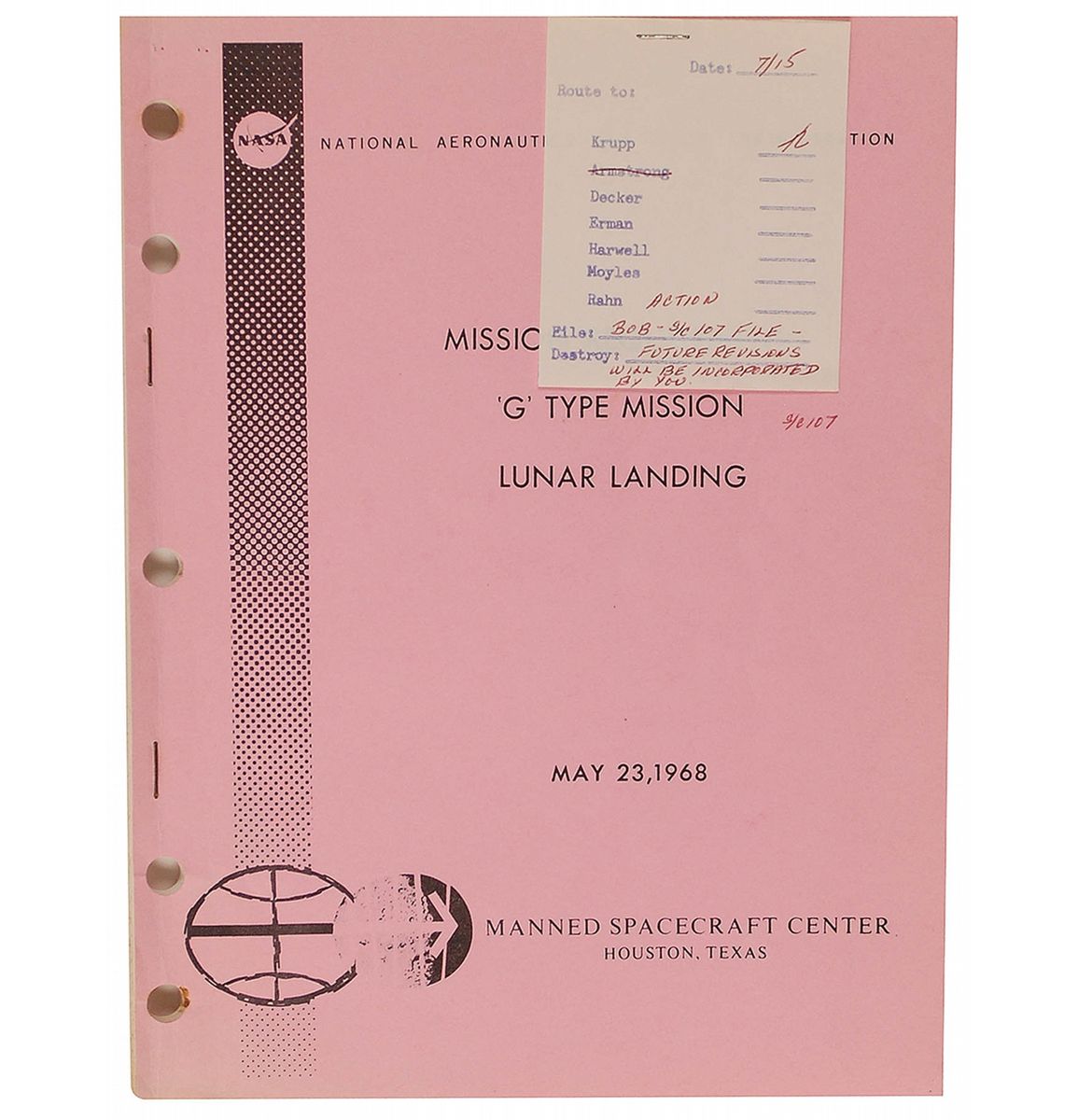 Printed Mission Requirements ‘G’ Type Mission Lunar Landing manual, dated May 23, 1968, 8 x 10.5, bound by two staples on the left edge. Introduction to the manual states the mission's purpose is “to perform a manned lunar landing and return and to perform selenological inspection, survey and sampling.” This manual was the personal copy of Bob Rahn, who was later hired by ABC News as an on-air expert during the Apollo missions. Rahn has made pencil notations throughout the manual, including one reference to the EMU writing “Extravehicular mobility unit.” In fine condition, with a small form stapled to front cover and light handling wear.