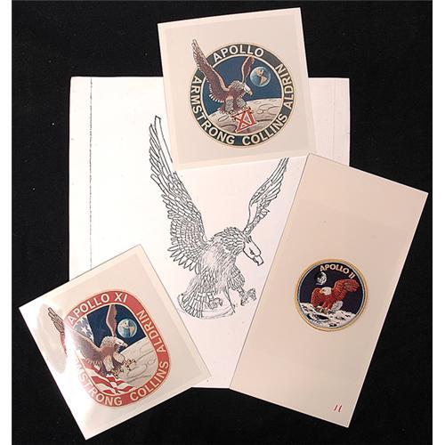 <Our item number 138355><B>Apollo 11, 1969, Artist Al Steven's Crew Patch Artwork.</B> An unusual lot of four different crew patch artworks by Al Stevens, including: 1) a printed sketch (9x10", small faults) of the "Eagle" that has been "hand retouched" by the artist, 2) two small, vintage color photos (4.75x4.75") of the artist's concept art (One is of the original concept painting included as a lot in this sale) and, 3) a small vintage color photo (4x8") of the finished, accepted patch design. A great, unusual lot. <BR>Estimated Value $350 - 500. <BR><BR>Our item number 138355<BR><IMAGES><P ALIGN="CENTER"><IMG SRC="http://www.goldbergcoins.net/liveauction/49jpegs/138355.jpg"> </P></IMAGES>