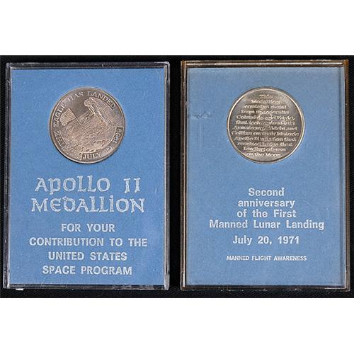 <Our item number 136987><B>Apollo 11, 1969, FLOWN Manned Flight Awareness Medallion.</B> Lot of two similar medallions, each reading on the reverse: "This medallion contains metal from spacecrafts Columbia and Eagle, that took astronauts Armstrong, Aldrin and Collins…." Both medallions are contained in plastic cases with blue inserts as issued by Manned Flight Awareness for the "Second Anniversary of the First Manned Lunar Landing, July 20, 1971". The medallions themselves were the same as issued in 1969. An attractive and desirable pair. <BR>Estimated Value $250 - 350. <BR><BR>Our item number 136987<BR><IMAGES><P ALIGN="CENTER"><IMG SRC="http://www.goldbergcoins.net/liveauction/49jpegs/136987.jpg"> </P></IMAGES>