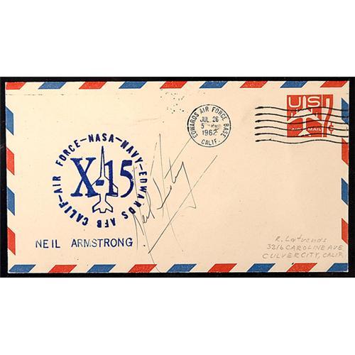<Our item number 138361><B>Apollo 11, 1969, Neil Armstrong Autograph.</B> A classic autograph on a 1962 X-15 launch cover with a blue handstamped cachet and a July 26th, Edwards AFB machine cancel. The cover is pristine with a light pencil address. Rarely seen and highly desirable. <BR>Estimated Value $500 - 750. <BR><BR>Our item number 138361<BR><IMAGES><P ALIGN="CENTER"><IMG SRC="http://www.goldbergcoins.net/liveauction/49jpegs/138361.jpg"> </P></IMAGES>