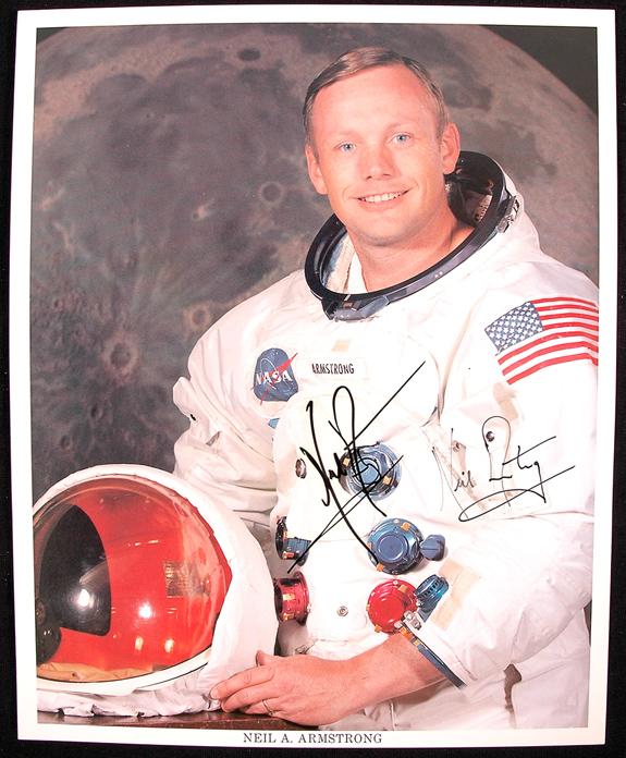 Apollo 11, 1969, Neil Armstrong Autograph. On a NASA 8x10" color lithograph depicting him in his white space suit. There are both autopen and original autographs on the lithograph making this an excellent reference piece for any collection. Pristine condition.