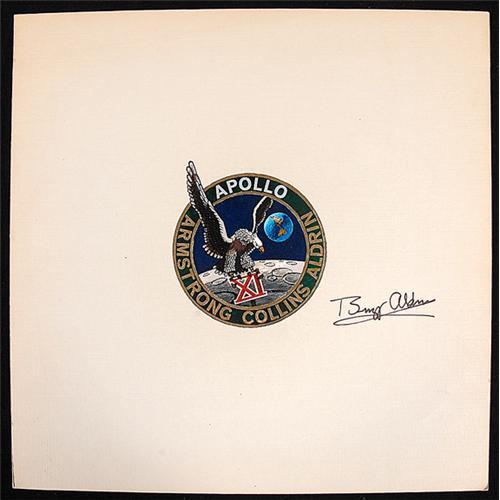 <Our item number 138354><B>Apollo 11, 1969, Original Unaccepted "Crew Patch" Painting by Al Stevens.</B> (12x12") This multicolor crew patch mixed media painting by the artist Al Stevens is on posterboard and has been signed by Buzz Aldrin after the fact. Only three different design proposal paintings of Stevens for Apollo 11 are known to exist, not counting the accepted design painting whose whereabouts is unknown. Artists were invited to submit proposed crew patch designs, based on concepts decided by the astronauts, for approval prior to the flight. The artist was chosen, and the design refined, based on these paintings. All of these artworks are unique unto themselves and are an important part of history. The story of the evolution of the crew patch is discussed in Michael Collin's books "Carrying the Fire" where he says he came up with a sketch of an eagle based on a suggestion from James Lovell. Stevens, who is credited with having made the final designs for Apollo 1, 7, 9 and 10, was undoubtedly involved at some point in the design for Apollo 11, 12 and 17 as based on this artwork. Striking. <BR>Estimated Value $3,500 - 5,000. <BR><BR>Our item number 138354<BR><IMAGES><P ALIGN="CENTER"><IMG SRC="http://www.goldbergcoins.net/liveauction/49jpegs/138354.jpg"> </P></IMAGES>