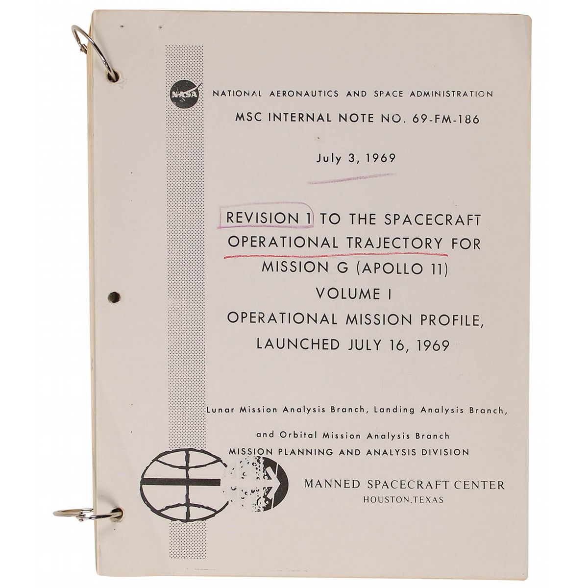 Printed Revision 1 to the Spacecraft Operational Trajectory for Mission G (Apollo 11) Volume I, Operational Mission Profile, dated July 3, 1969, 8 x 10.5, bound by two rings on the left edge. Introduction inside states “A detailed operational mission profile for a typical free return lunar landing mission is presented in this volume.” This manual was the personal copy of Bob Rahn, who was later hired by ABC News as an on-air expert during the Apollo missions. Rahn has made pencil notations throughout the manual, including one about visual tracking of the LM by the CM, “Can CM see LM land? No.” In fine condition, with aforementioned notations and underlines and light handling wear.
