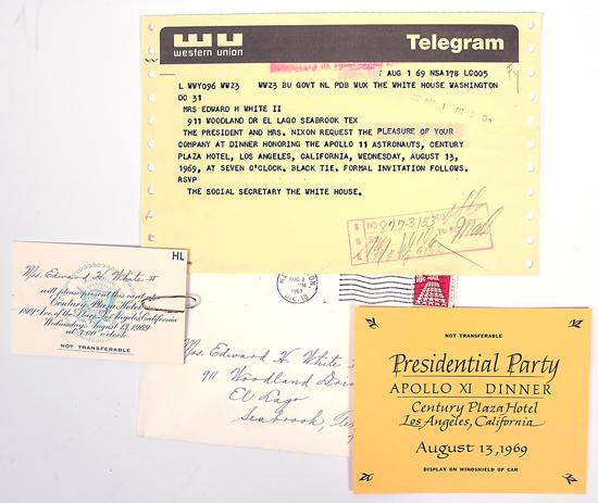 Apollo 11, 1969, "Presidential Dinner" Telegram and Invitation. Included in this lot are 1) the original August 1, 1969 telegram send to Mrs Edward H. White II from the Social Secretary, the White House that reads: "The President and Mrs Nixon request the pleasure of your company at dinner honoring the Apollo 11 astronauts, Century Plaza Hotel, Los Angeles, California, Wednesday, August 13, 1969, at seven o'clock, Black tie. Formal invitation follows. RSVP", 2) the original envelope with "The White House" cornercard addressed to Mrs. Edward H. White, 3) the engraved formal invitation to the dinner (Not Transferable", 2.5x4") with paper clip and 4) a yellow Windshield card marked "Presidential Party / Apollo XI Dinner / Century Plaza Hotel / Los Angeles, California / August 13, 1969". ALSO included is a blank KSC Apollo 11 launch pass with lapel clip. An important lot that was rarely saved at the time and seldom seen today. Excellent overall condition.