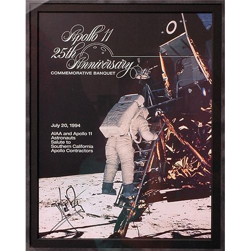 <Our item number 138582><B>Apollo 11, 1994, Neil Armstrong Autograph.</B> Signed on the multi-colored cover of the Apollo 11, 25th Anniversary Banquet Program. Held in Los Angeles near Universal Studios, Armstrong was unable to attend due to flight delays (mechanical and weather). The consignor was asked at the last minute to step in and MC the event. This writer was in attendance and can tell you, from personal experience, that the banquet hall was packed and a great time was had by all. Jose Jimenez paid a visit, ably assisted by Wally Schirra playing the straight man. Somehow, after the first few minutes, nobody noticed Armstrong's absence.<BR><BR>The cover is professionally double matted against black matting and grey suede (17.5x20"). Copies of Armstrong's letter to the organizing committee, and the Committee's letter to the consignor thanking him for stepping in and sending him the enclosed cover as their thank you, are included. Selected guests received a small lunar roc k replica (offered in separate lots in this sale, see lots 117 & 118) as a "Thank You" from the Committee also. A great piece of memorabilia. <BR>Estimated Value $750 - 1,000. <I><BR>Ex. The comedian Bill Dana/Jose Jimenez collection.</I> <BR><BR>Our item number 138582<BR><IMAGES><P ALIGN="CENTER"><IMG SRC="http://www.goldbergcoins.net/liveauction/49jpegs/138582.jpg"> </P></IMAGES>
