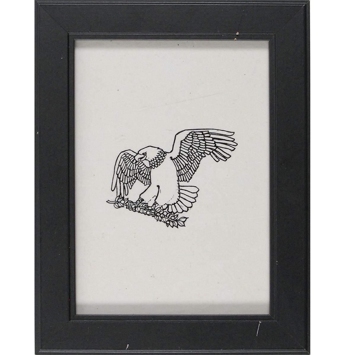 Original pen and ink sketch of an eagle with an olive branch in its talons, done by artist Alan Stevens on a 4.5 x 6.5 sheet. Framed to an overall size of 6.5 x 8.5. In fine condition. Stevens did the final design artwork for Apollo 1, 7, 9, and 10 and made design proposals for Apollo 11, 12, and 17. Provenance: Goldberg, 2008.