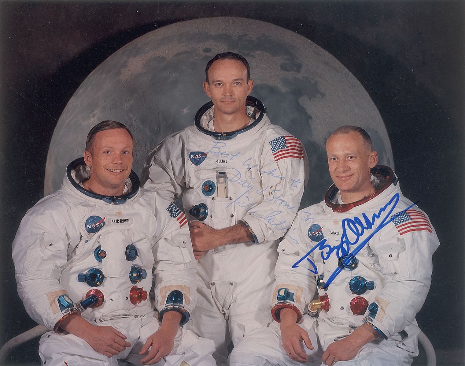 Color satin-finish 10 x 8 photo of the Apollo 11 crew posing in their white space suits, signed and inscribed in blue ballpoint, "Best wishes to David Stone Jr., Mike Collins," and in blue felt tip, "Buzz Aldrin.” In fine condition, with one small surface crease above Collins' head. Accompanied by a full letter of authenticity from Zarelli Space Authentication.