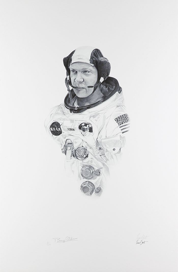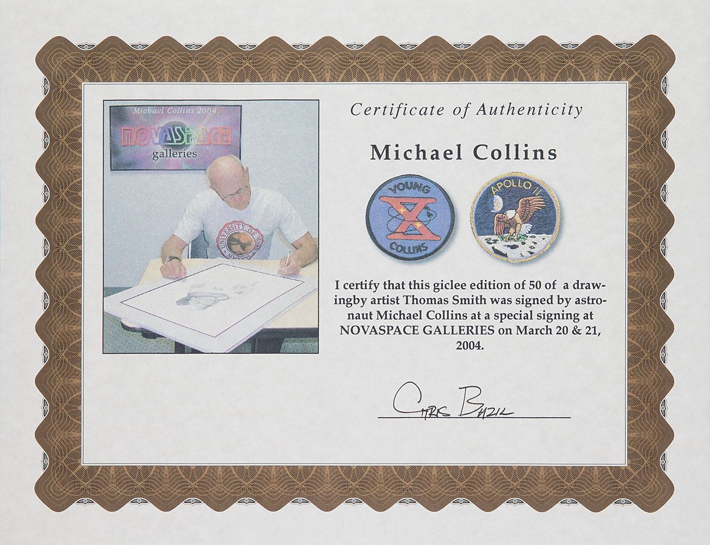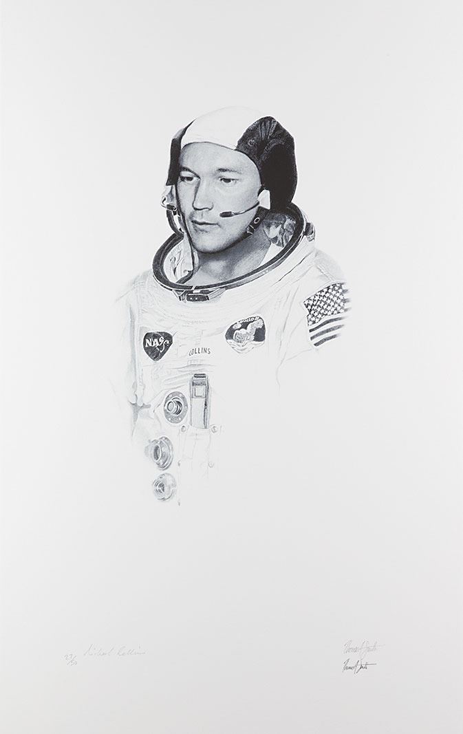 Desirable pairing of oversized limited edition 19 x 29 prints by Thomas Smith, done in the style of Paul Calle's famous Neil Armstrong portrait: one of Buzz Aldrin, showing him wearing the famous 'Snoopy cap' communications carrier, numbered 6/50, signed in the lower border in pencil, "Buzz Aldrin" and "Thomas A. Smith"; and one of Michael Collins in the 'Snoopy cap,' numbered 27/50, neatly signed in the lower border in pencil, "Michael Collins" and "Thomas A. Smith." In overall very fine condition. Accompanied by a certificate of authenticity from Novaspace for the Collins autograph. A perfect duo of companions to the great Calle piece.