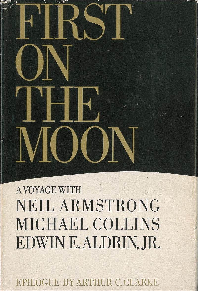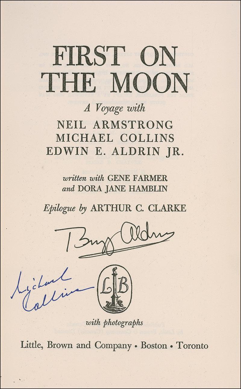 Signed book: First on the Moon. Book club edition. Boston: Little, Brown, and Company, 1970. Hardcover with dustjacket, 5.75 x 8.5, 511 pages. Signed on the title page in black ink by Buzz Aldrin and in blue ink by Michael Collins. In fine condition, with some scattered light toning and soiling to dustjacket, as well as some light edge tears and creases. Pre-certified Scott Cornish and RRAuction COA.