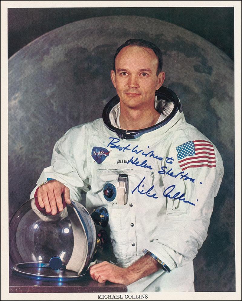 Two color 8 x 10 NASA photos, one of Aldrin signed and inscribed in black felt tip, “To David Duncan, With best wishes, Buzz Aldrin”; and one of Michael Collins, signed and inscribed in blue felt tip “Best wishes to Helen Shelton, Mike Collins.” In fine condition.