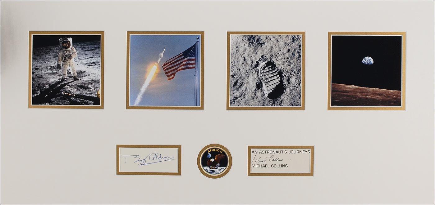 Blue felt tip signatures of Buzz Aldrin on a 4 x 1.5 slip and a black felt tip signature of Michael Collins on a 4 x 1.5 slip clipped from the book An Astronaut’s Journeys, double-matted with an Apollo 11 mission logo and four color images from the moon landing mission to an overall size of 30 x 14. In fine condition. Oversized.