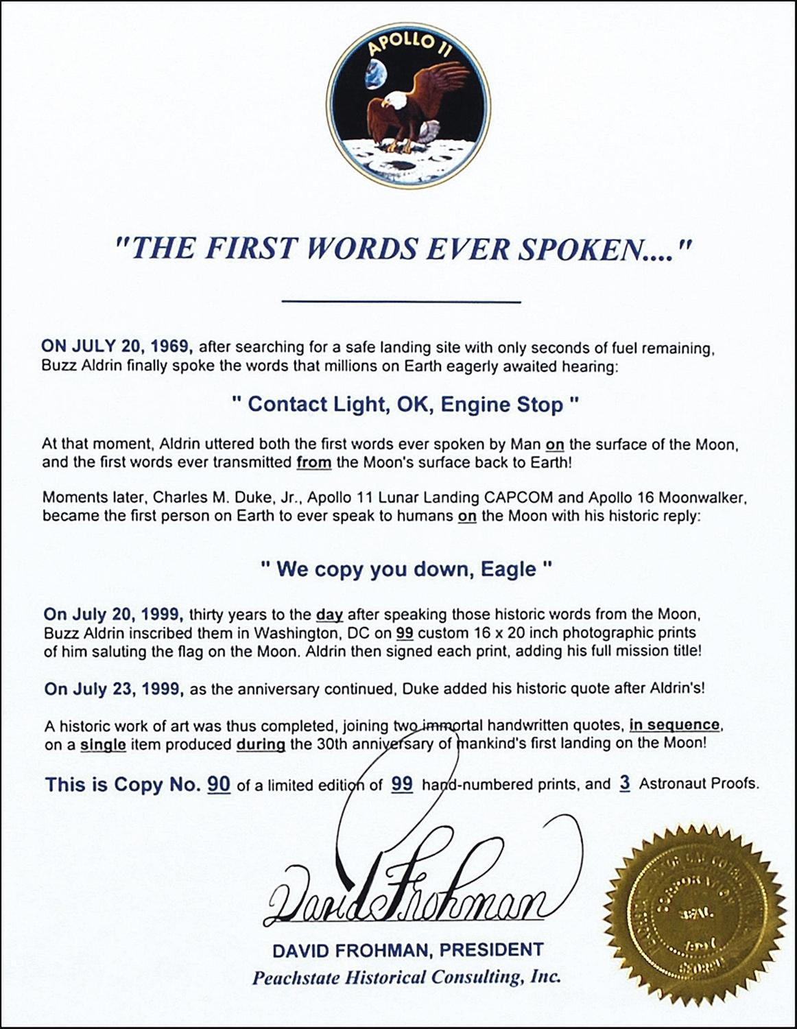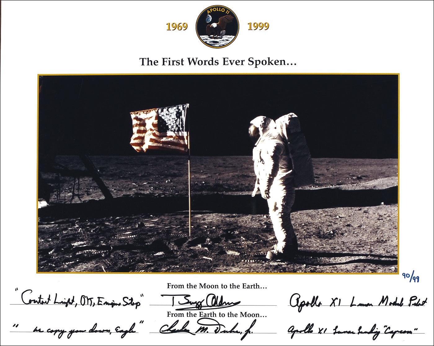 Color 20 x 16 limited edition manuscript print of Aldrin on the lunar surface, numbered 90/99, commemorating the first words spoken from the moon, signed in black felt tip by the two astronauts who made the exchange between the moon and mission control: “‘Contact light, OK, Engine stop,’ Buzz Aldrin, Apollo XI Lunar Module Pilot” and “‘We copy you down, Eagle,’ Charles M. Duke, Jr., Apollo XI Lunar Landing ‘CAPCOM.’” Rolled and in fine condition.