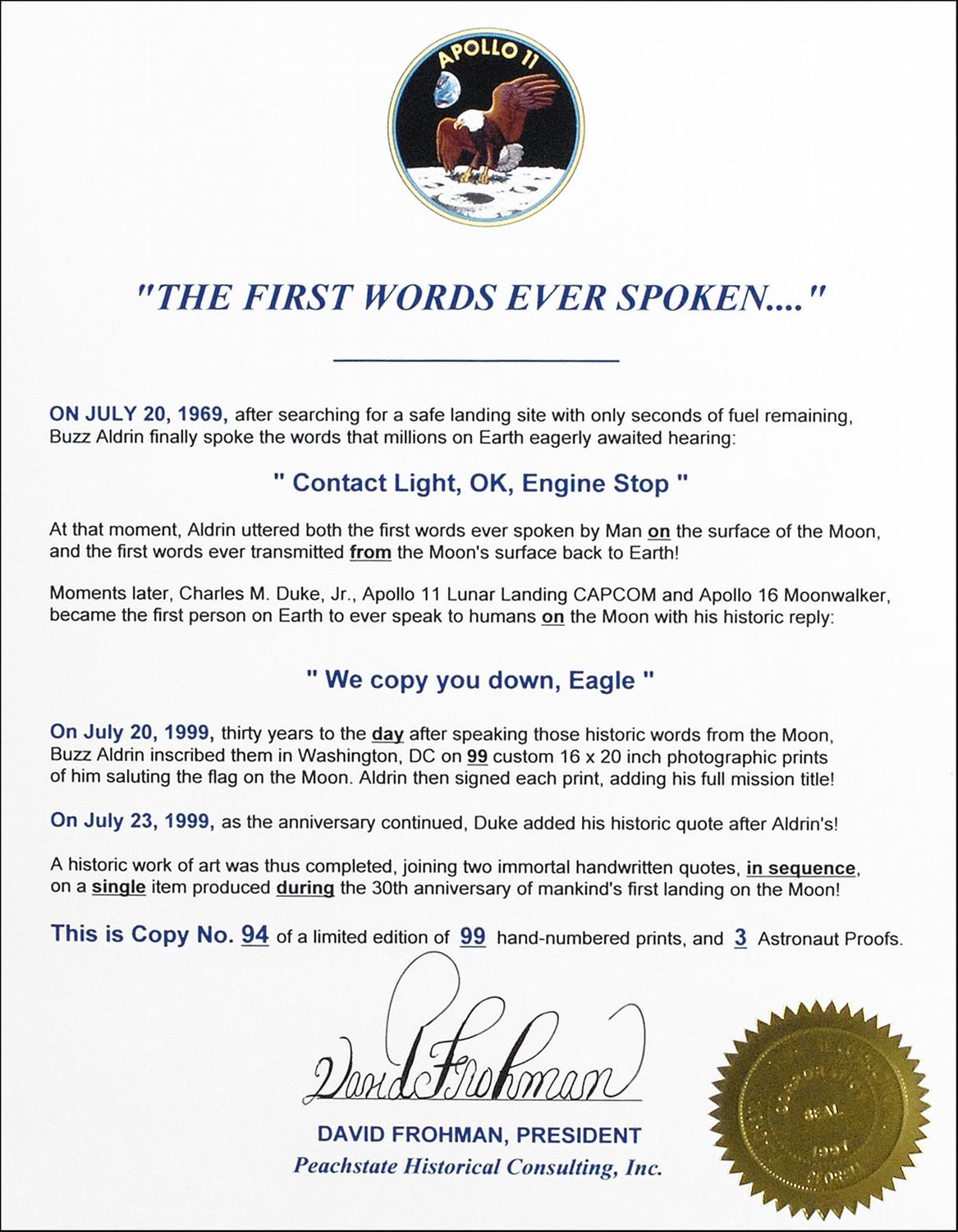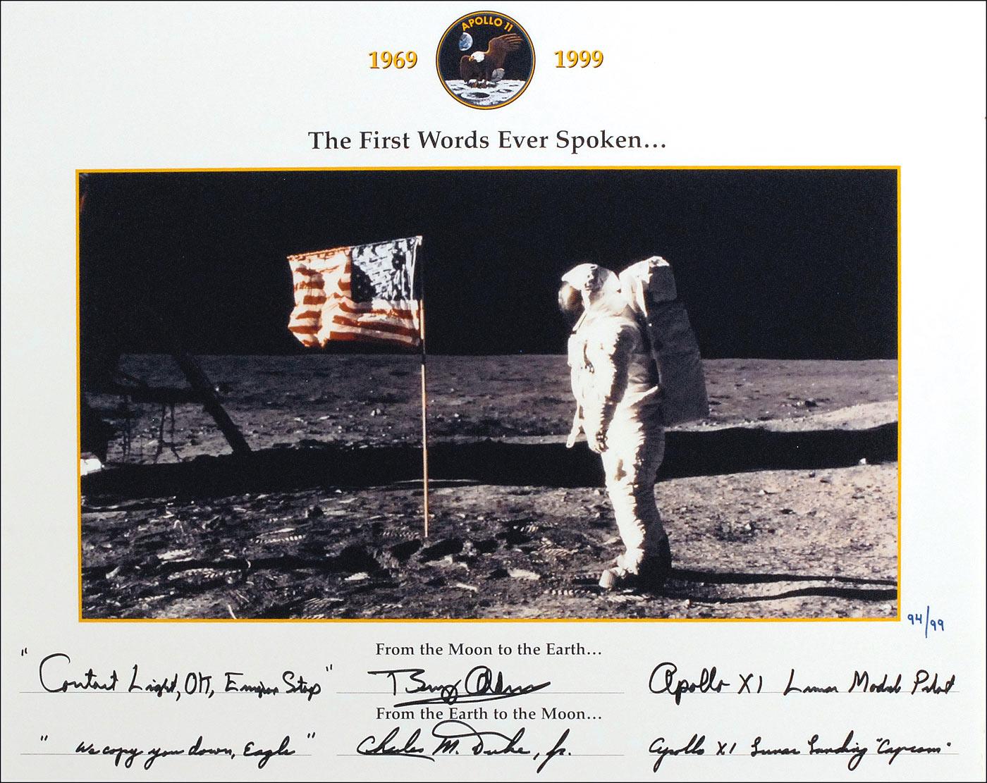 Color 20 x 16 limited edition manuscript print of Aldrin on the lunar surface, numbered 94/99, commemorating the first words spoken from the moon, signed in black felt tip by the two astronauts who made the exchange between the moon and mission control: “‘Contact light, OK, Engine stop,’ Buzz Aldrin, Apollo XI Lunar Module Pilot” and “‘We copy you down, Eagle,’ Charles M. Duke, Jr., Apollo XI Lunar Landing ‘CAPCOM.’” In fine condition.