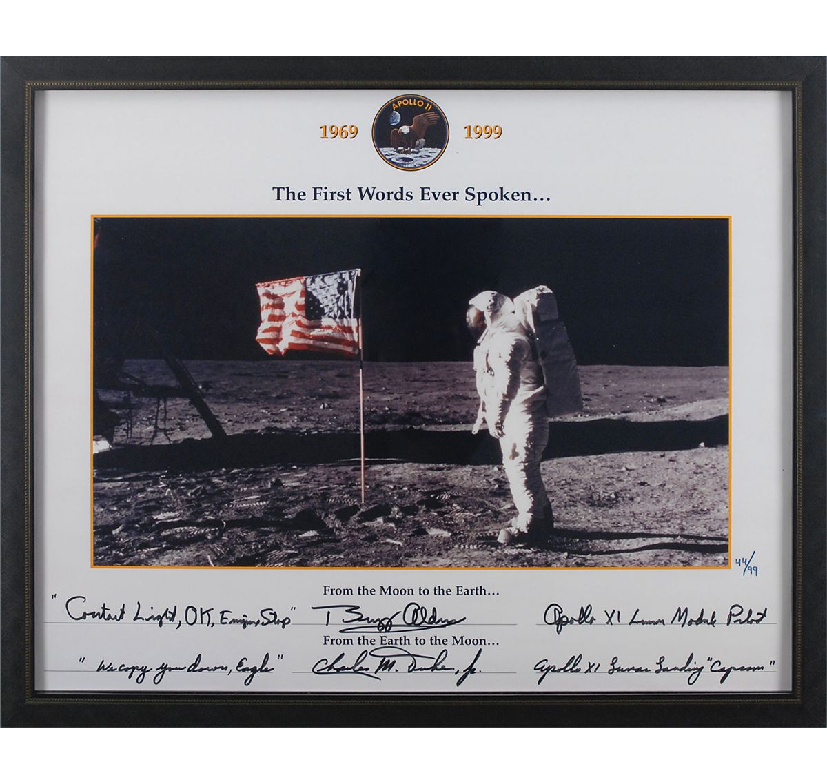 Color 19.5 x 15.5 limited edition print of Aldrin on the lunar surface, numbered 44/99, commemorating the first words spoken from the moon, signed in black felt tip by the two astronauts who made the exchange between the moon and mission control: “‘Contact light, OK, Engine Stop,’ Buzz Aldrin, Apollo XI Lunar Module Pilot” and, “‘We copy you down, Eagle,’ Charles M. Duke, Jr., Apollo XI Lunar Landing ‘CAPCOM.’” Framed to an overall size of 21.25 x 17.25. In fine condition.