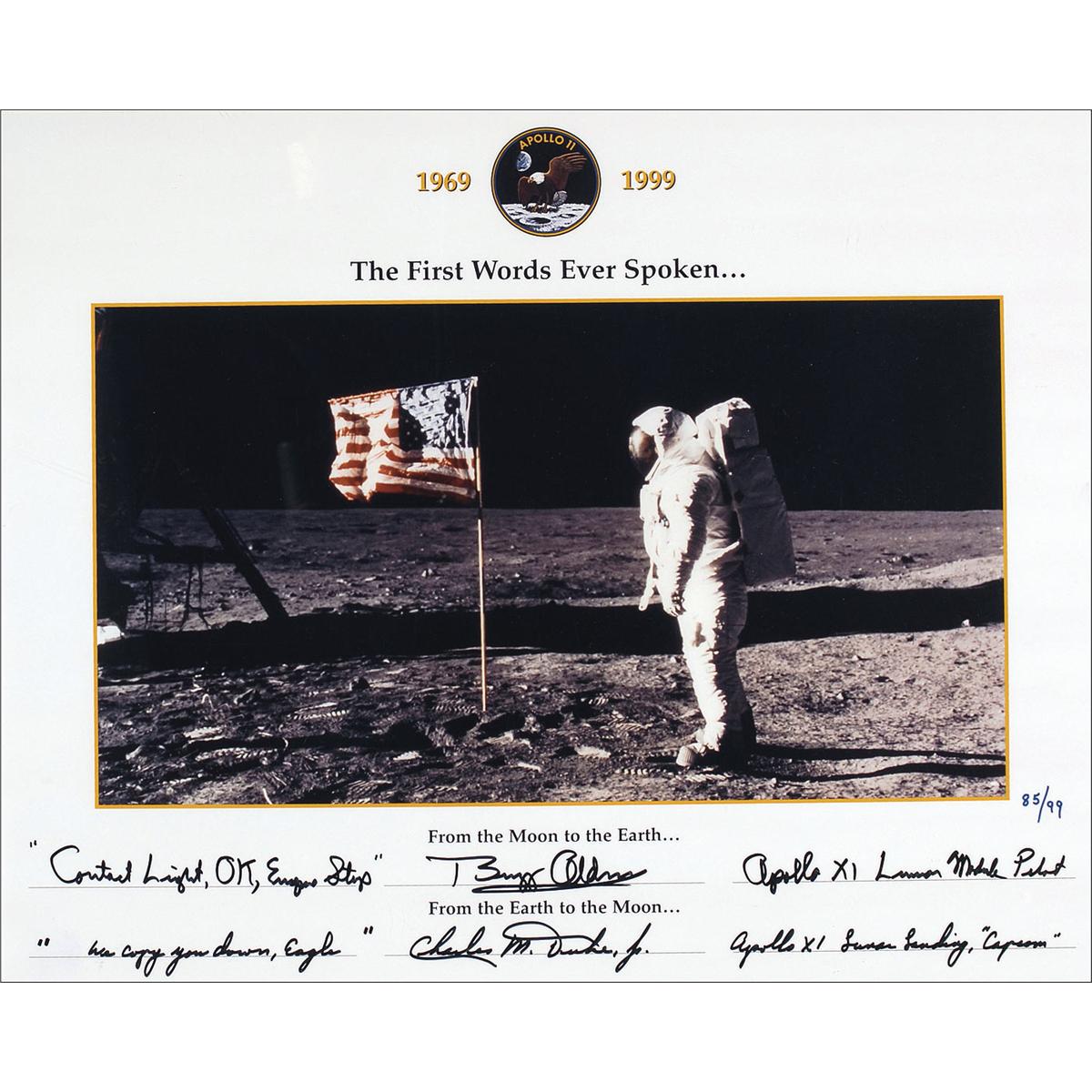 Color 20 x 16 limited edition manuscript print of Aldrin on the lunar surface, numbered 85/99, commemorating the first words spoken from the moon, signed in black felt tip by the two astronauts who made the exchange between the moon and mission control: “‘Contact light, OK, Engine stop,’ Buzz Aldrin, Apollo XI Lunar Module Pilot” and “‘We copy you down, Eagle,’ Charles M. Duke, Jr., Apollo XI Lunar Landing ‘CAPCOM.’” Rolled and in fine condition.