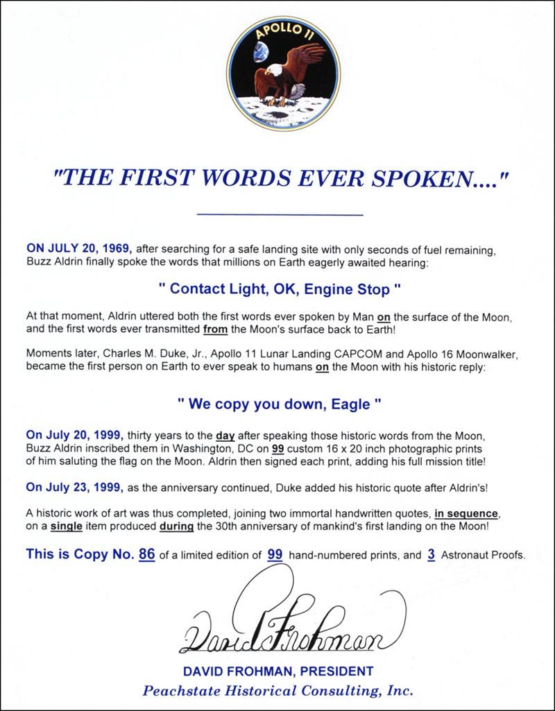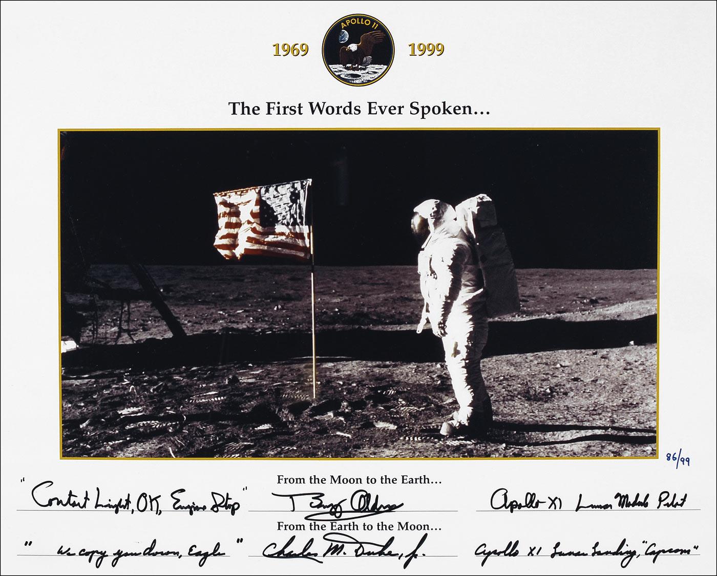 Color 20 x 16 limited edition manuscript print of Aldrin on the lunar surface, numbered 86/99, commemorating the first words spoken from the moon, signed in black felt tip by the two astronauts who made the exchange between the moon and mission control: “‘Contact light, OK, Engine stop,’ Buzz Aldrin, Apollo XI Lunar Module Pilot” and “‘We copy you down, Eagle,’ Charles M. Duke, Jr., Apollo XI Lunar Landing ‘CAPCOM.’” Rolled and in fine condition.