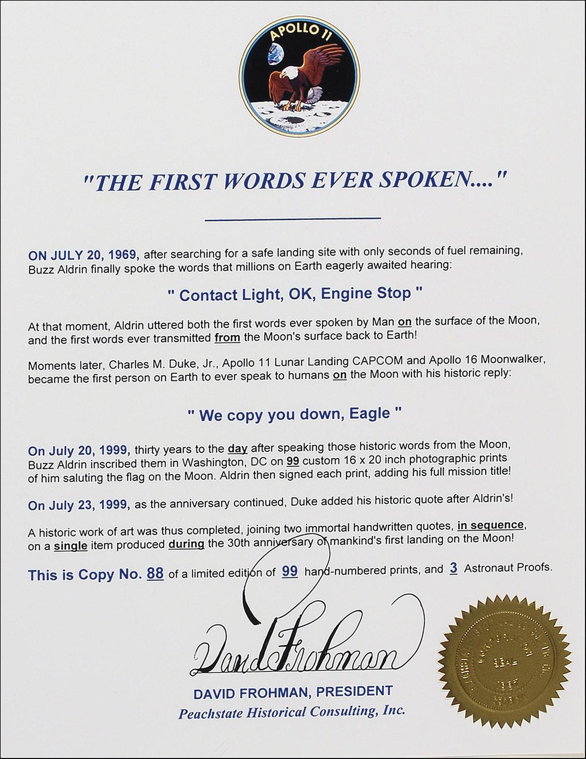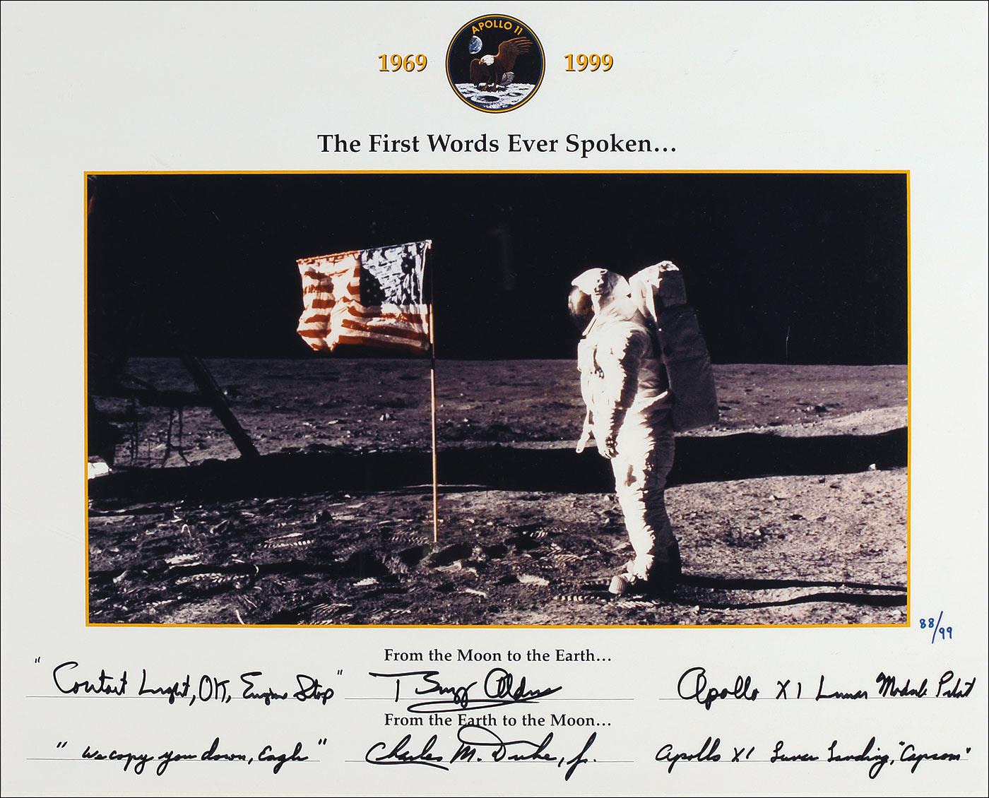 Color 20 x 16 limited edition manuscript print of Aldrin on the lunar surface, numbered 88/99, commemorating the first words spoken from the moon, signed in black felt tip by the two astronauts who made the exchange between the moon and mission control: “‘Contact light, OK, Engine stop,’ Buzz Aldrin, Apollo XI Lunar Module Pilot” and “‘We copy you down, Eagle,’ Charles M. Duke, Jr., Apollo XI Lunar Landing ‘CAPCOM.’” Rolled and in fine condition.