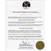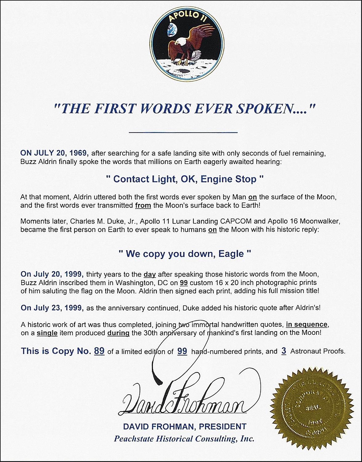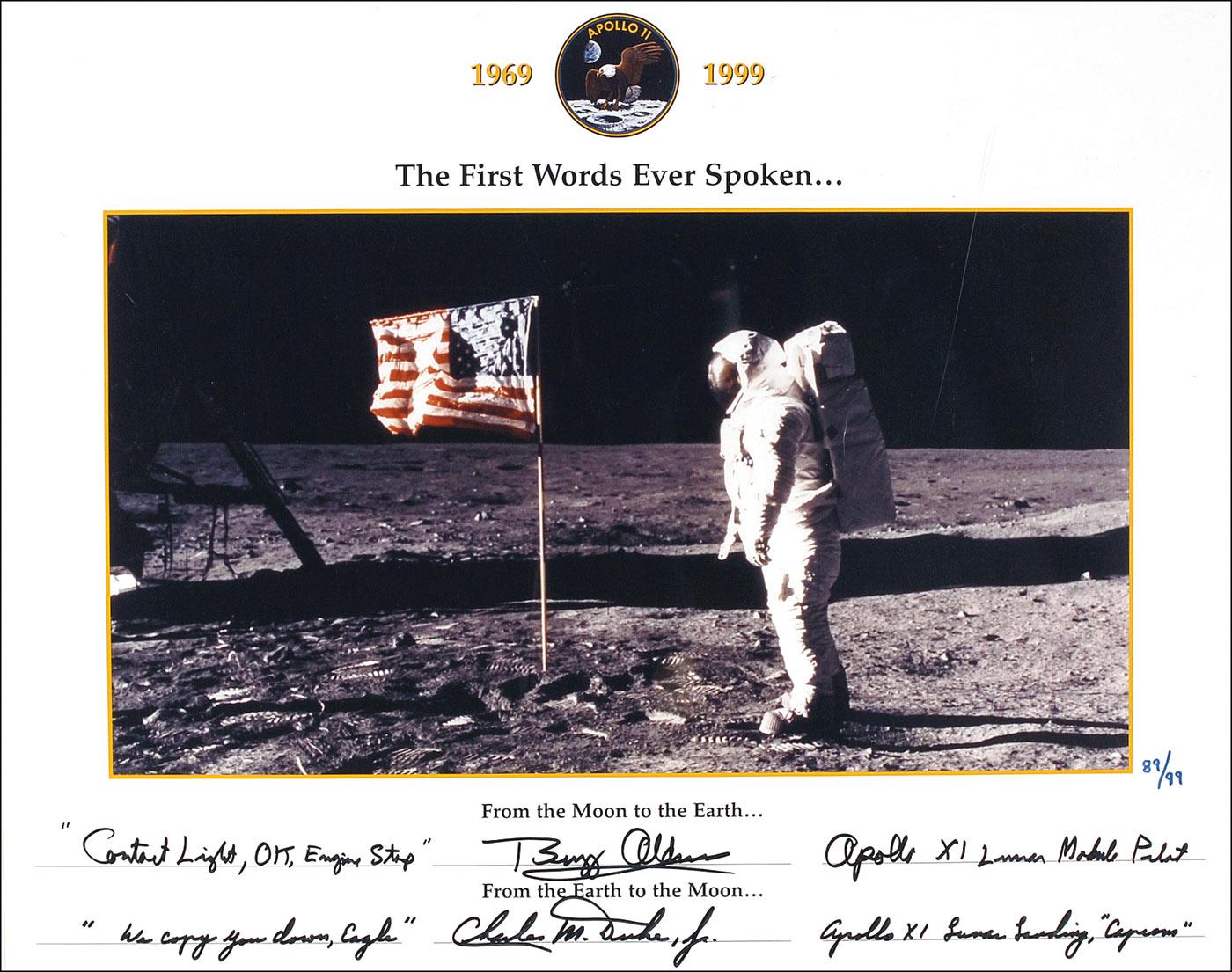 Color 20 x 16 limited edition manuscript print of Aldrin on the lunar surface, numbered 89/99, commemorating the first words spoken from the moon, signed in black felt tip by the two astronauts who made the exchange between the moon and mission control: “‘Contact light, OK, Engine stop,’ Buzz Aldrin, Apollo XI Lunar Module Pilot” and “‘We copy you down, Eagle,’ Charles M. Duke, Jr., Apollo XI Lunar Landing ‘CAPCOM.’” Rolled and in fine condition.