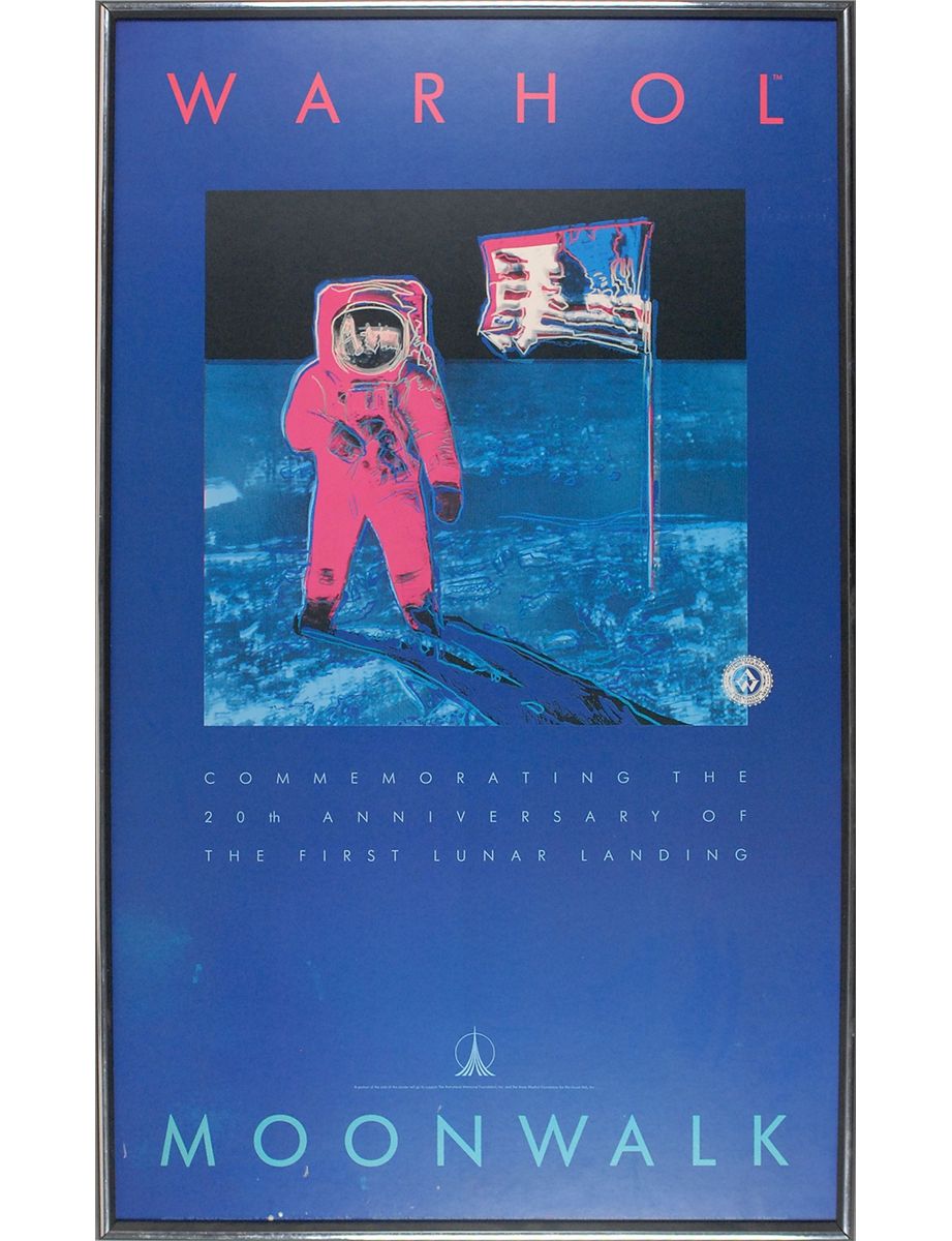 Colorful unsigned poster of Warhol’s work entitled “Moonwalk,” 23 x 39, depicting Buzz Aldrin next to the American flag on the lunar surface. Framed (with no glass) to an overall size of 24.5 x 40.5. Surface marks and dings to the bottom portion, otherwise fine condition.