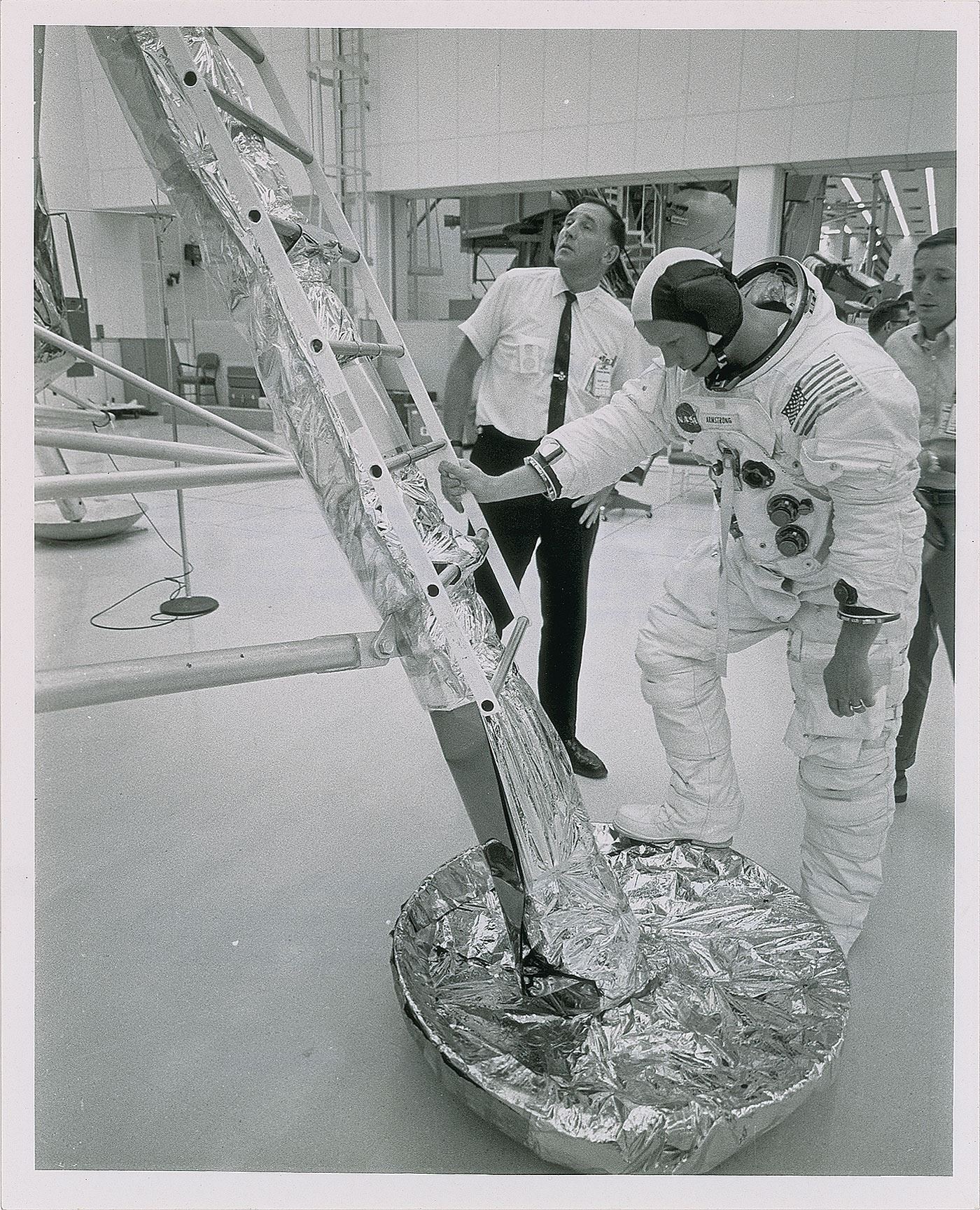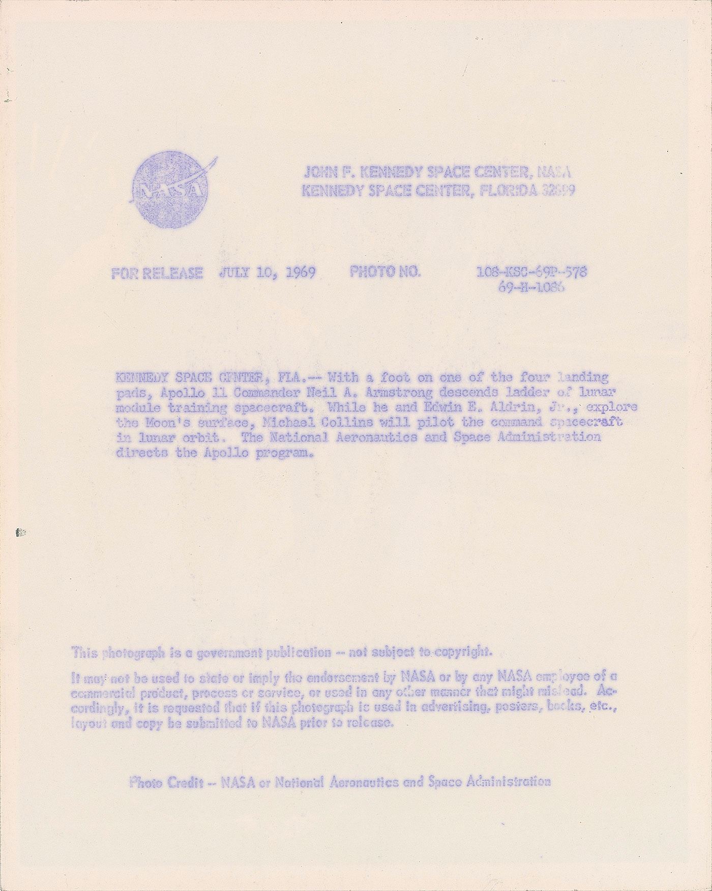 Original vintage glossy 8 x 10 NASA photo of Commander Neil Armstrong descending the ladder of the Lunar Module Eagle during training exercises. Reverse of photo bears official purple NASA caption text. In fine condition. An uncommon image of Armstrong performing an action that would soon be immortalized in history.