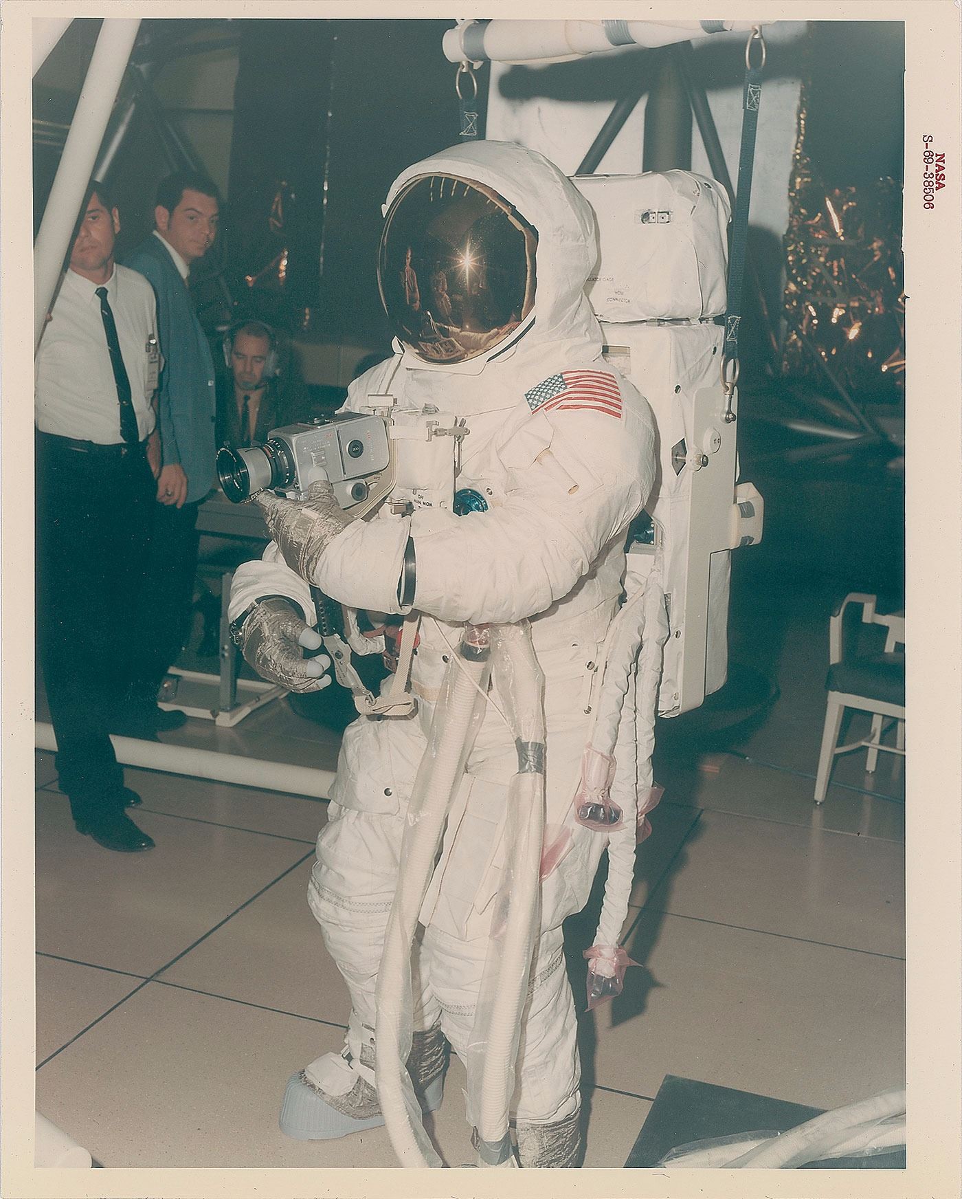 Original vintage color glossy 8 x 10 red-numbered NASA photo of Commander Neil Armstrong donning his white space suit with dropped visor and Hasselblad camera during Apollo 11 training activities. Reverse of photo bears “A Kodak Paper” watermarks. In fine condition.
