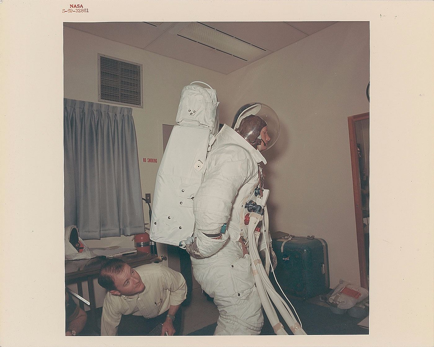 Original vintage color glossy 10 x 8 red-numbered NASA photo of Commander Neil Armstrong wearing his space suit during an Apollo 11 fitting procedure, with NASA employee seen checking the position of the Primary Life Support System (PLSS) oxygen, water, and cooling controls. Reverse of photo bears “A Kodak Paper” watermarks. In fine condition.
