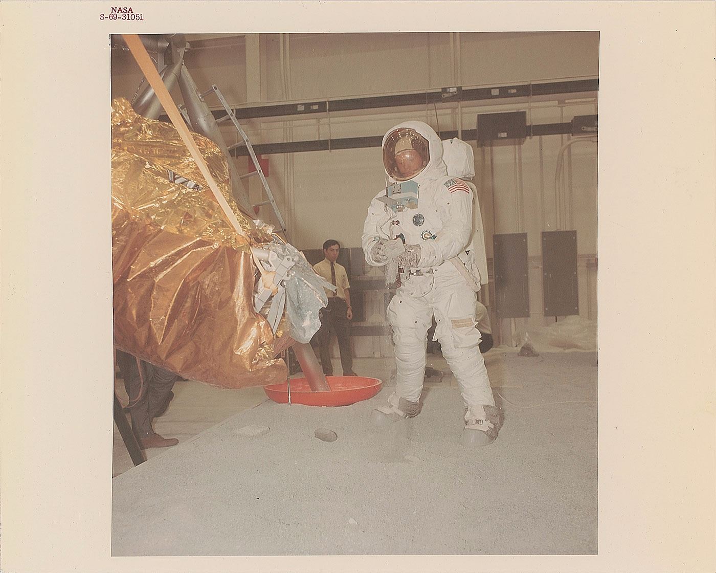 Original vintage color glossy 10 x 8 red-numbered NASA photo of Commander Neil Armstrong picking up a rock near the leg of the lunar module during an Apollo 11 training exercise. Reverse of photo bears “A Kodak Paper” watermarks. In fine condition.