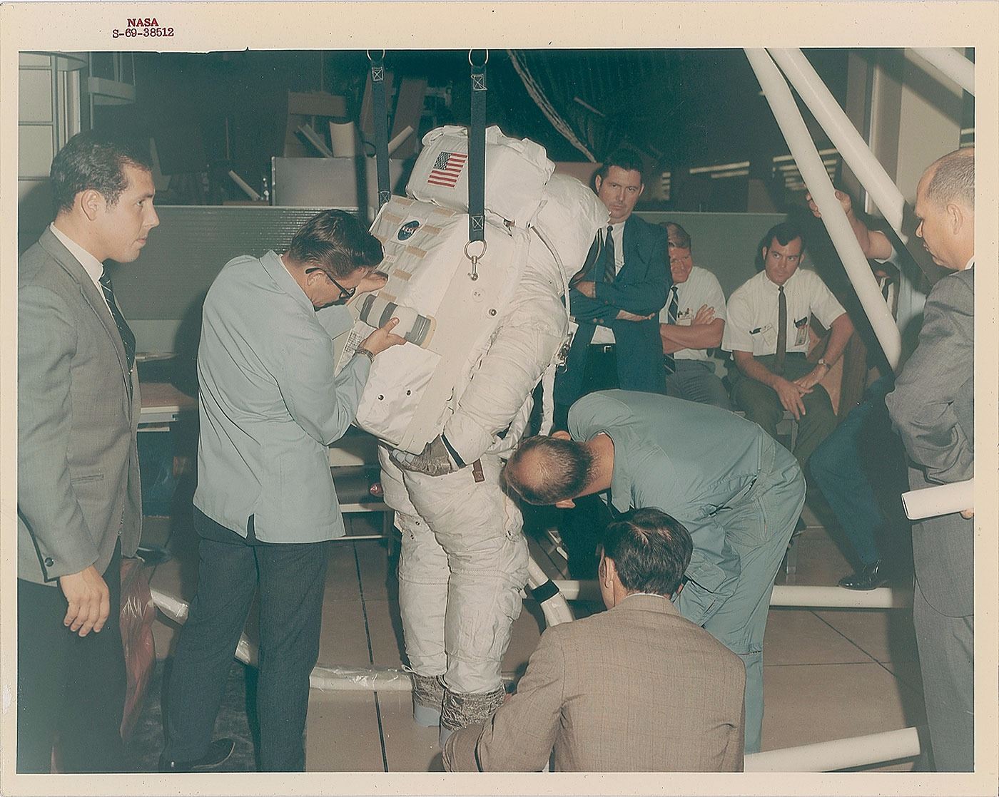 Original vintage color glossy 10 x 8 red-numbered NASA photo of several men, including LMP Buzz Aldrin, attending to Commander Neil Armstrong during a training exercise for the Primary Life Support System. Reverse of photo bears “A Kodak Paper” watermarks. In fine condition.
