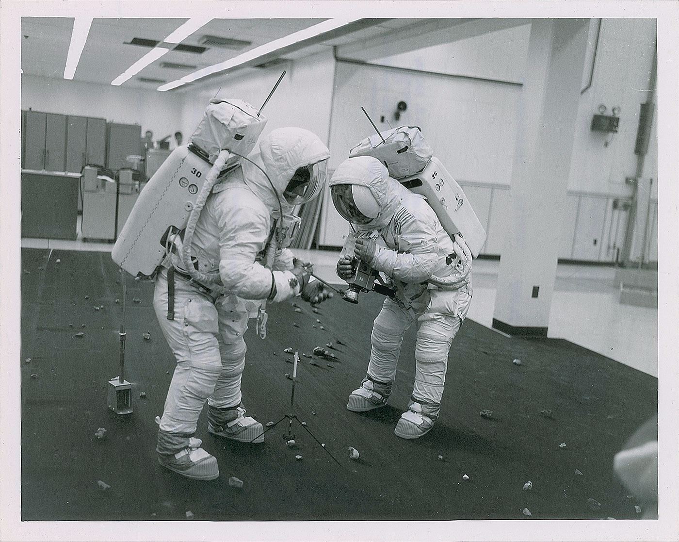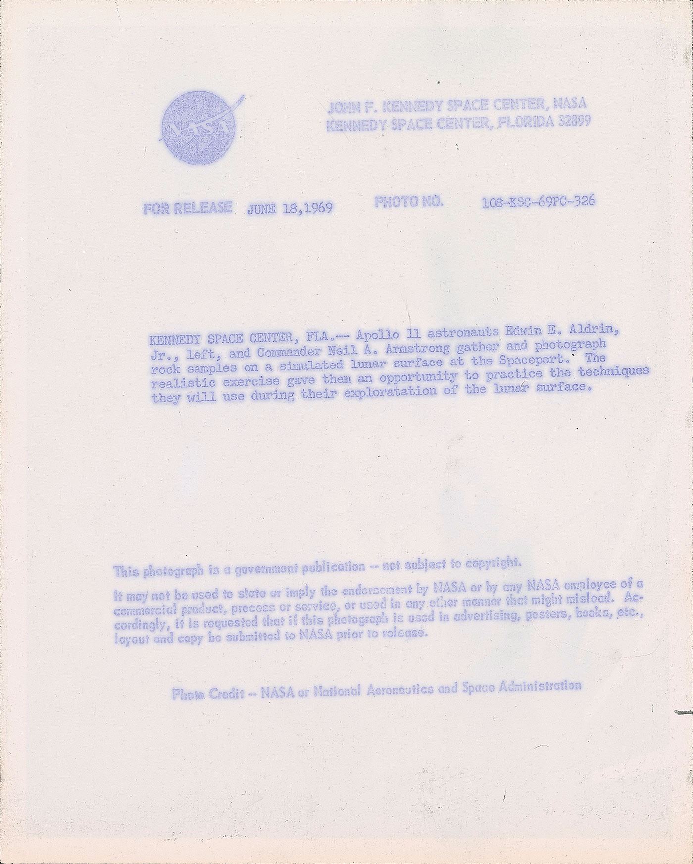 Original vintage glossy 10 x 8 NASA photo of Commander Neil Armstrong and Lunar Module Pilot Buzz Aldrin gathering and photographing rock samples on a simulated lunar surface at KSC's Spaceport. Reverse of photo bears official purple NASA caption text. In fine condition.