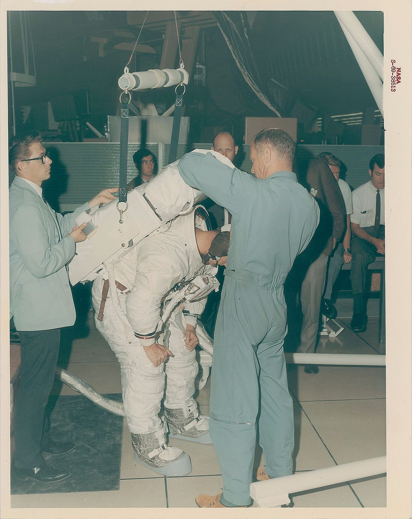 Original vintage color glossy 8 x 10 red-numbered NASA photo of Lunar Module Pilot Buzz Aldrin helping Commander Neil Armstrong remove his Primary Life Support System during Apollo 11 training activities. Reverse of photo bears “A Kodak Paper” watermarks. In fine condition.