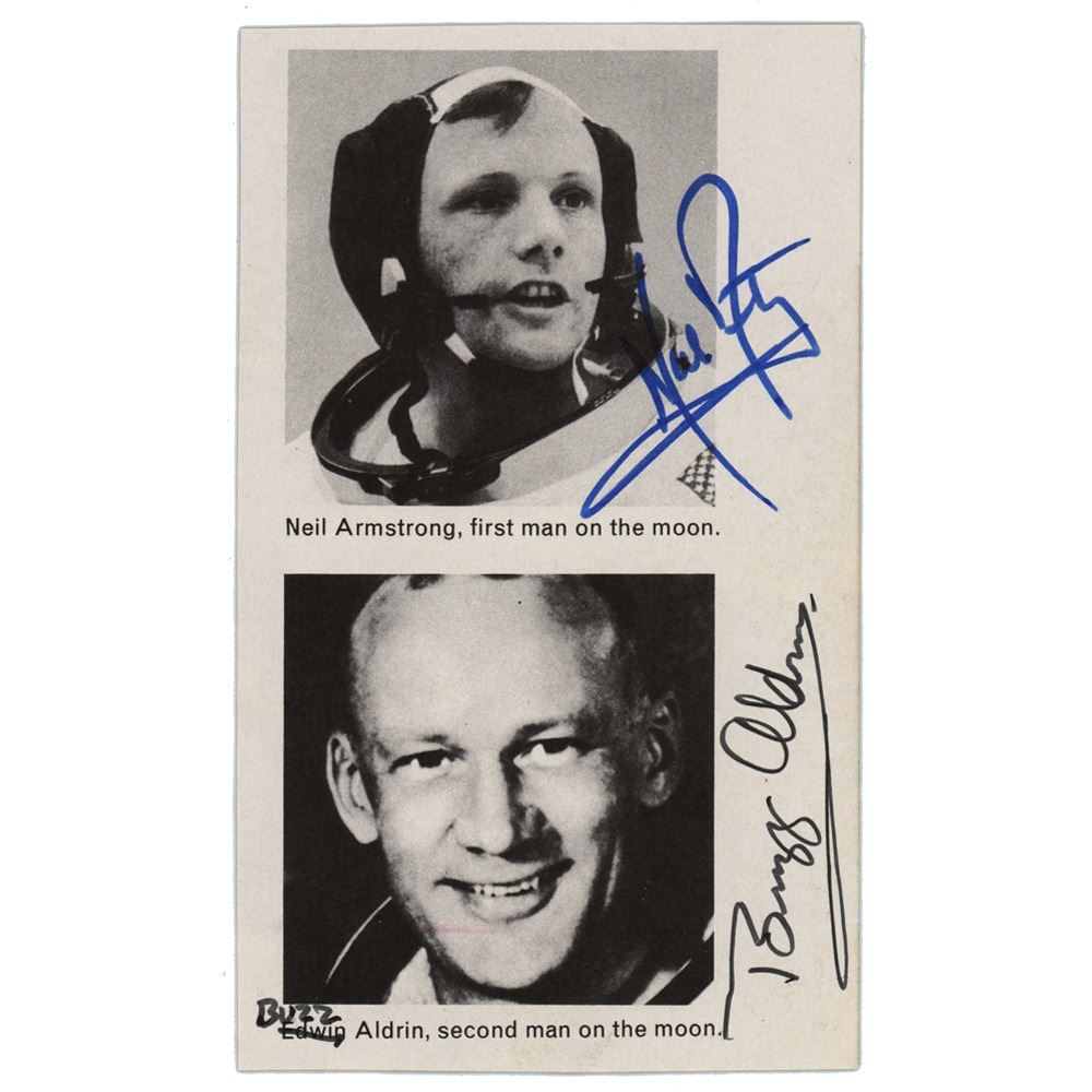 Desirable 2.75 x 4.75 photo of the Apollo 11 moonwalkers clipped from a book, signed in blue felt tip, "Neil Armstrong," and in black felt tip, "Buzz Aldrin." Aldrin also strikes through "Edwin" in the caption of his portrait, writing "Buzz" instead. In very fine condition. An ideal pairing of bright, bold autographs from these pioneering astronauts.