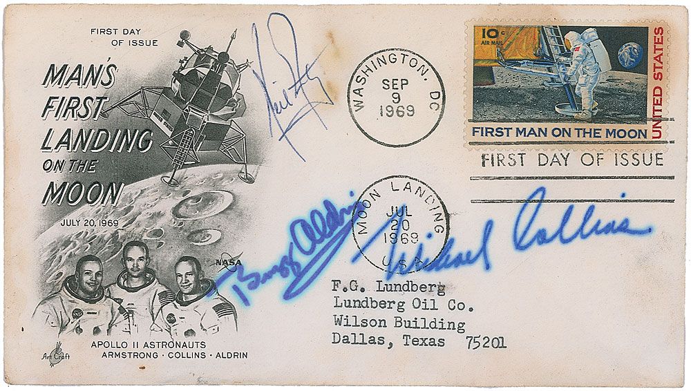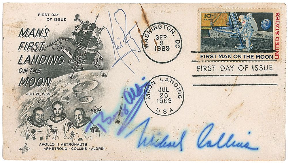 Two FDCs, with identical cachets honoring the first moon landing, both signed in blue ballpoint by Neil Armstrong and in blue felt tip by Buzz Aldrin. Both covers also bear autopen signatures of Michael Collins. In good condition, with rusty paperclip mark to top edges, one lightly affecting Armstrong’s signature, mild spreading to both the Aldrin and Collins signatures, and scattered toning and soiling.