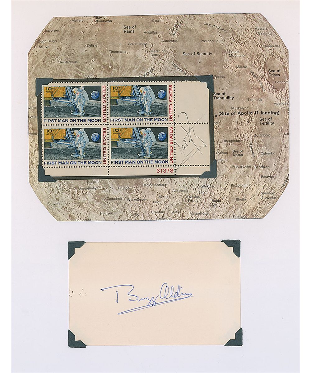 Two items: a plate block of four ‘first man on the moon’ 10-cent postage stamps, 5 x 3, signed in black ink in the white right border by Neil Armstrong; and a ballpoint signature, “Buzz Aldrin,” on an off-white 5 x 3 card. In fine condition, with a rusty paperclip mark to left edge of Aldrin’s card, which could be easily matted out.