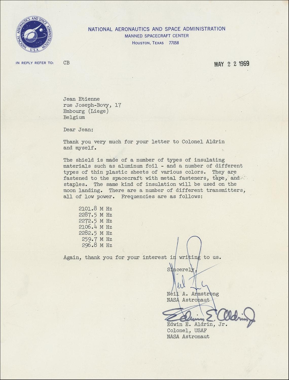 TLS signed “Neil Armstrong” in blue ballpoint and “Edwin E. Aldrin, Jr.,” in black felt tip, one page, 8 x 10.5, NASA letterhead, stamp dated May 22, 1969. A letter to a Belgian space enthusiast, written just a couple of months before their historic moon mission. In full: “Thank you very much for your letter to Colonel Aldrin and myself.