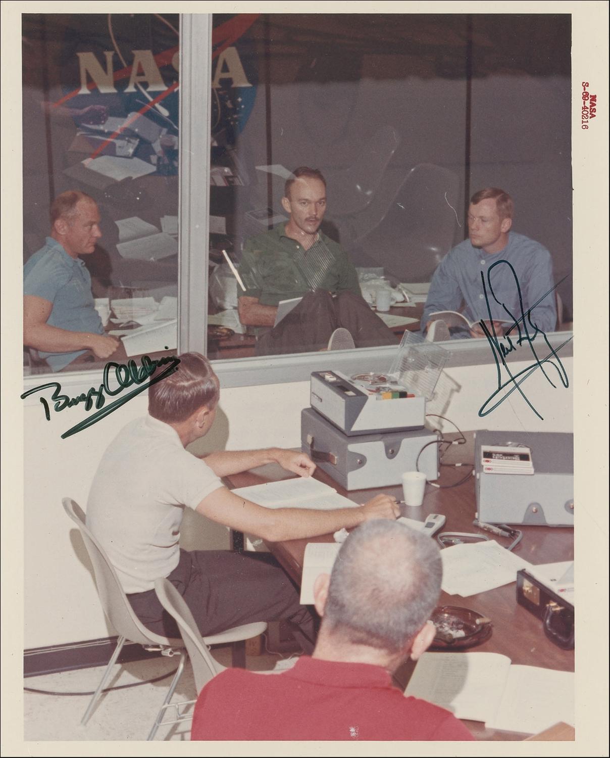 Color glossy 8 x 10 NASA ‘red-numbered’ photo of Armstrong, Aldrin, and Michael Collins going through their first post-flight debriefing in the Crew Reception Area of the Lunar Receiving Laboratory on July 27, 1969, signed in black felt tip by Neil Armstrong and Buzz Aldrin. In fine condition, with a few trivial edge dings. Any NASA numbered photo is indicative of being an original NASA photograph, and red-numbered NASA glossies are very desirable, and harder to find.