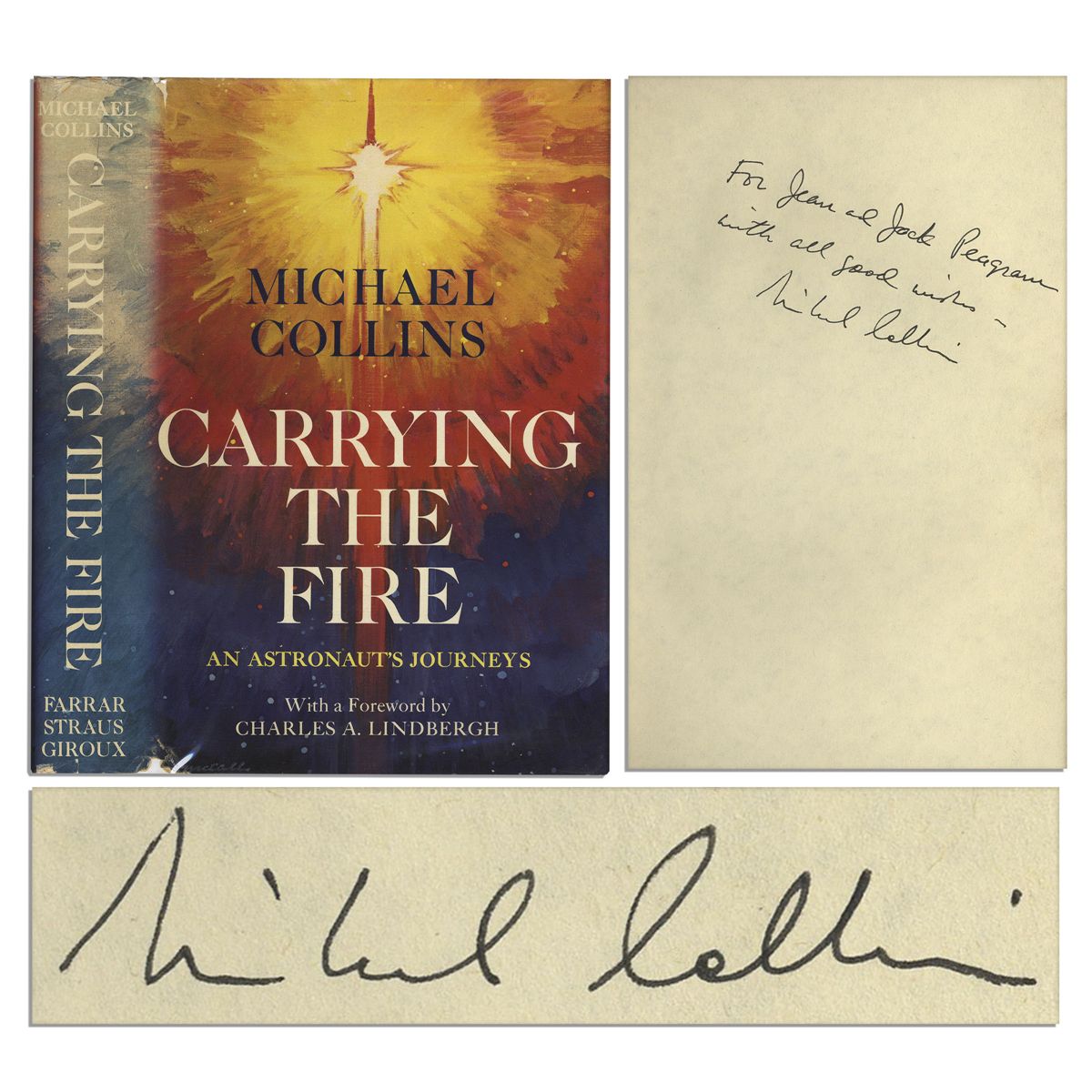 Apollo 11 astronaut Michael Collins signed memoir, ''Carrying The Fire / An Astronaut's Journeys''. Farrar, Straus & Giroux: New York: 1974. First edition, stated second printing. Signed and inscribed in bold, black ink to front free endpaper, ''For Jean and Jack Peagram / with all good wishes -- Michael Collins''. Collins records his NASA memories in this memoir, including those of his solo orbits to the dark side of the moon. 478pp. book measures 6'' x 9.25''. Includes original price-clipped dustjacket with minimal chips to spine. Maroon cloth boards are pristine. Overall, very good to near fine.