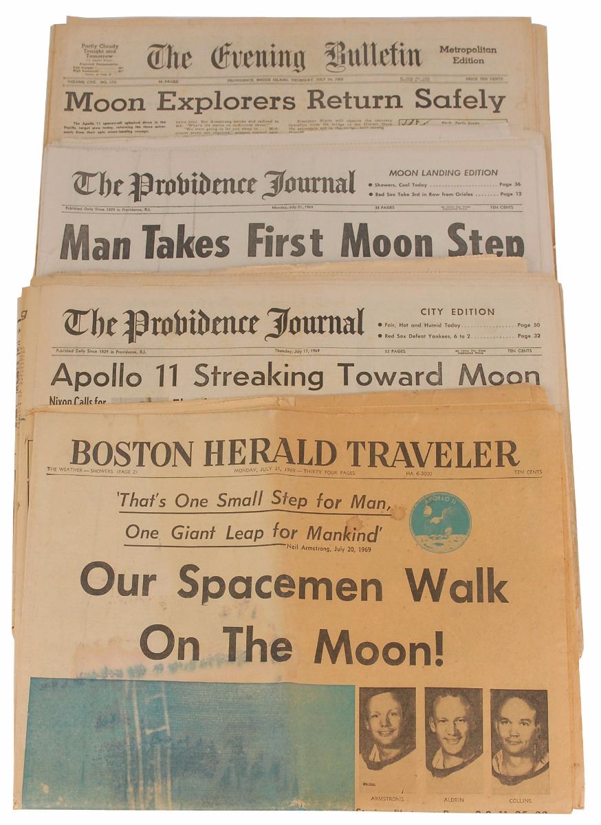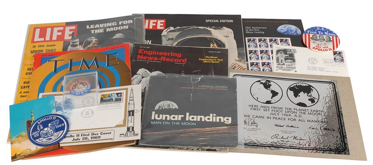 Collection of items related to Apollo 11, including: the 1969 special edition of Life Magazine entitled ‘To the Moon and Back’; the Time Magazine special supplement ‘To the Moon’ from July 18, 1969; the July 25, 1969, issue of Life Magazine entitled ‘Leaving for the Moon,’ with its scarce left-side flap; the July 24, 1969, of the Engineering News-Record; large hardcover book entitled Man's Greatest Adventure; two Apollo 11 pins; an Apollo 11 patch; a ‘Lunar Landing: Man on the Moon’ 45 rpm record; two FDCs; a stamp block; a postcard; an IBM poster entitled ‘The Moon Above, The Earth Below’; an astronaut souvenir pennant; and four different moon landing newspapers. In overall very good to fine condition.