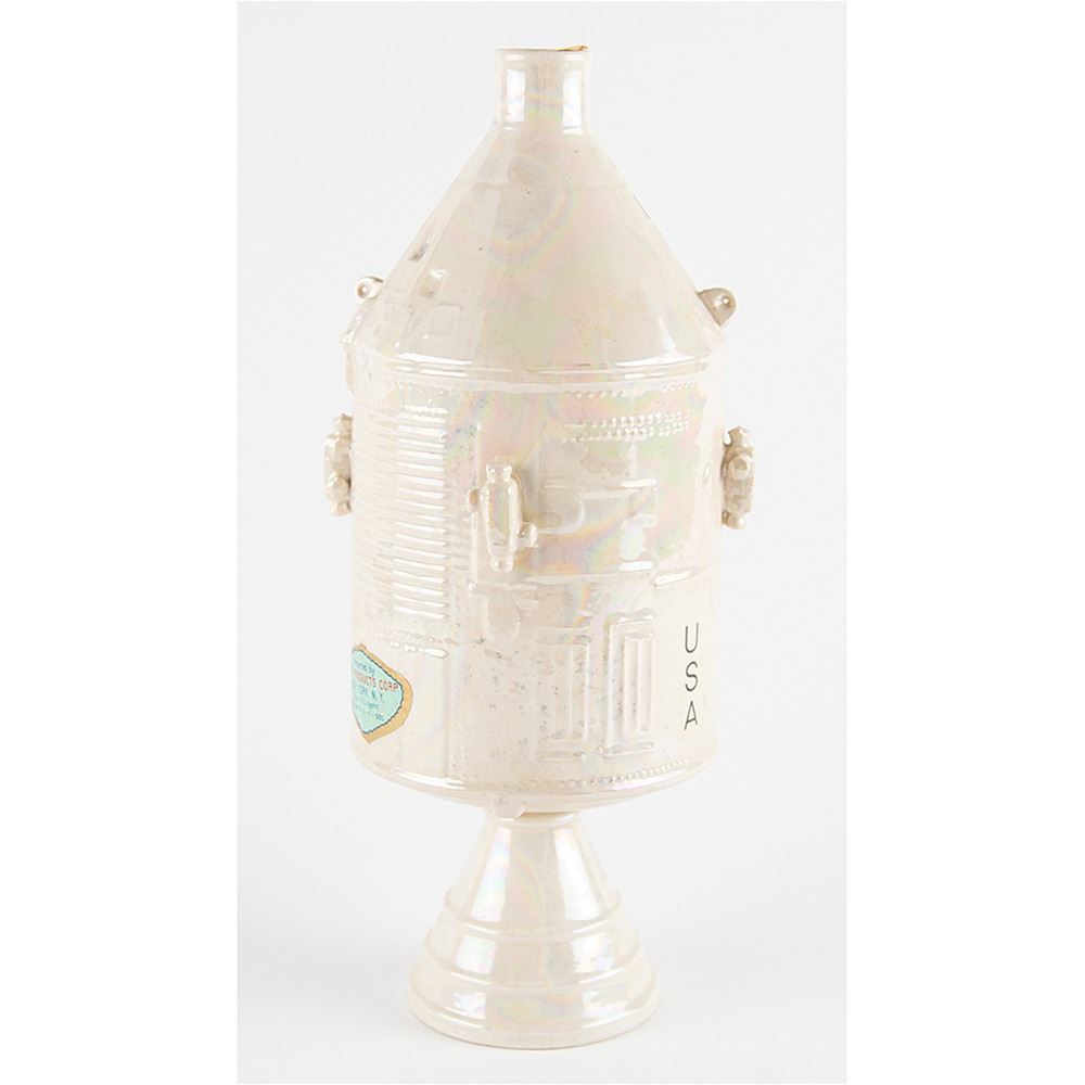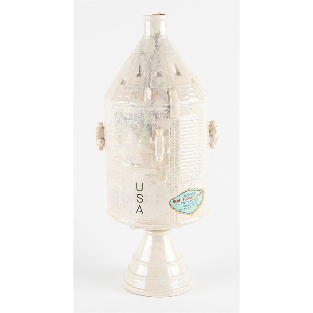 Vintage red wine decanter in the shape of the Apollo 11 Command Module Columbia, standing 11è in height and 5è in diameter, which contained one quart of Vino Rosso by Barsottini of Italy, where it was manufactured in 1969. Imported by Banfi Products Corp., of New York. The decanter retains its original cork and labels and features an American flag with ‰ÛÏUnited States-11‰Û to the upper command module section. The interior of the service propulsion engine nozzle bears the maker and importer stamp. In fine, empty condition.