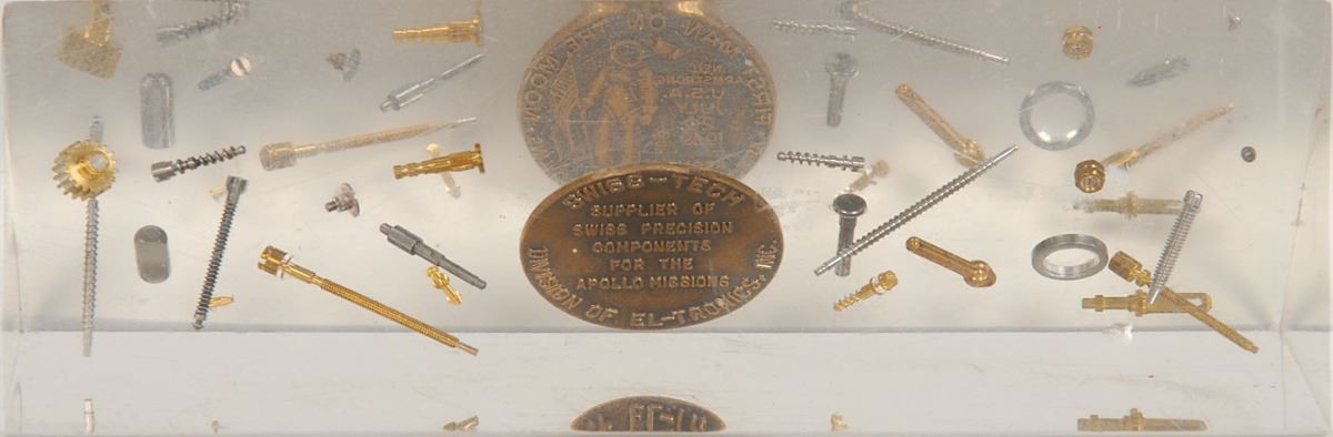Rare Swiss-Tech contractor medallion commemorating the Apollo 11 mission and first lunar landing, 1.25? in diameter, with a raised design on the face of Neil Armstrong standing with the American flag on the surface of the moon. The reverse bears raised contractor text, “Swiss-Tech, Division of El-Tronics, Inc. Supplier of Swiss precision components for the Apollo missions.” Medallion is encased in a triangular Lucite display, 6 x 2 x 2, with twenty-two free-floating Apollo spacecraft micro-precision parts. In fine condition. A brilliant, highly appealing display honoring all the working hands and moving parts of the historic Apollo 11 mission—the first such display that we have offered.