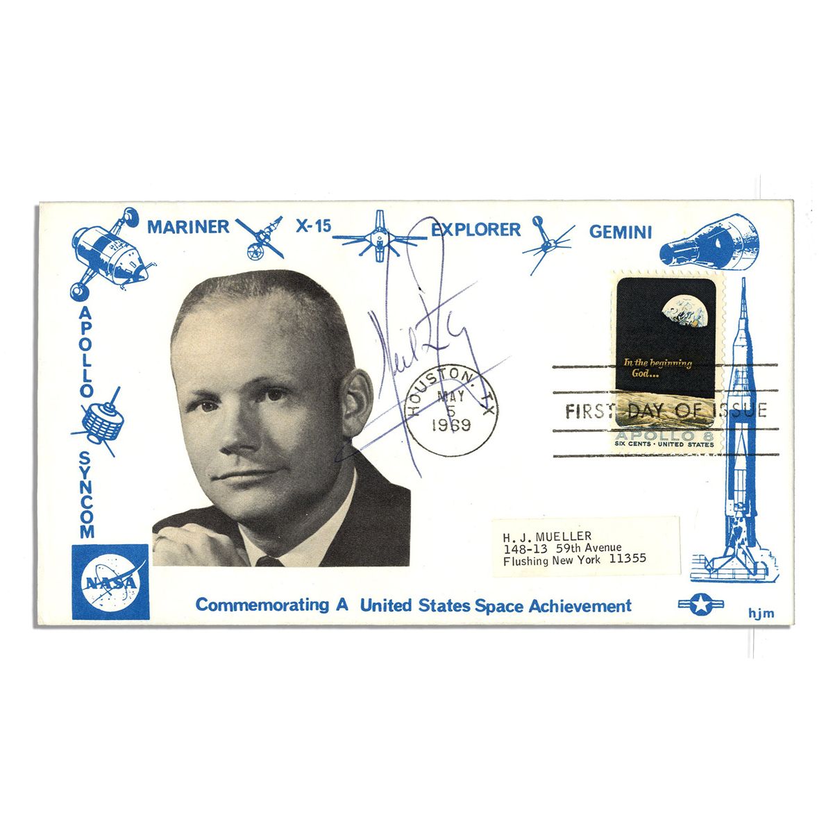 Apollo 11 crew-signed NASA photo. Smiling astronauts Neil Armstrong, Buzz Aldrin and Michael Collins each sign their spacesuits: ''Neil Armstrong'', ''Best Wishes to the Coles - M Collins'' and ''Buzz Aldrin''. Semi-matte photo measures 10'' x 8''. NASA backstamp on verso is printed above a short summary of Apollo 11. Minor creasing and pinhole to top edge. Album adhesive residue to verso. Very good. Accompanied by a COA from PSA/DNA for all signatures.