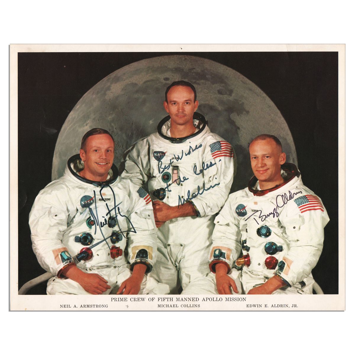 Apollo 11 crew-signed NASA photo. Smiling astronauts Neil Armstrong, Buzz Aldrin and Michael Collins each sign their spacesuits: ''Neil Armstrong'', ''Best Wishes to the Coles - M Collins'' and ''Buzz Aldrin''. Semi-matte photo measures 10'' x 8''. NASA backstamp on verso is printed above a short summary of Apollo 11. Minor creasing and pinhole to top edge. Album adhesive residue to verso. Very good. Accompanied by a COA from PSA/DNA for all signatures.