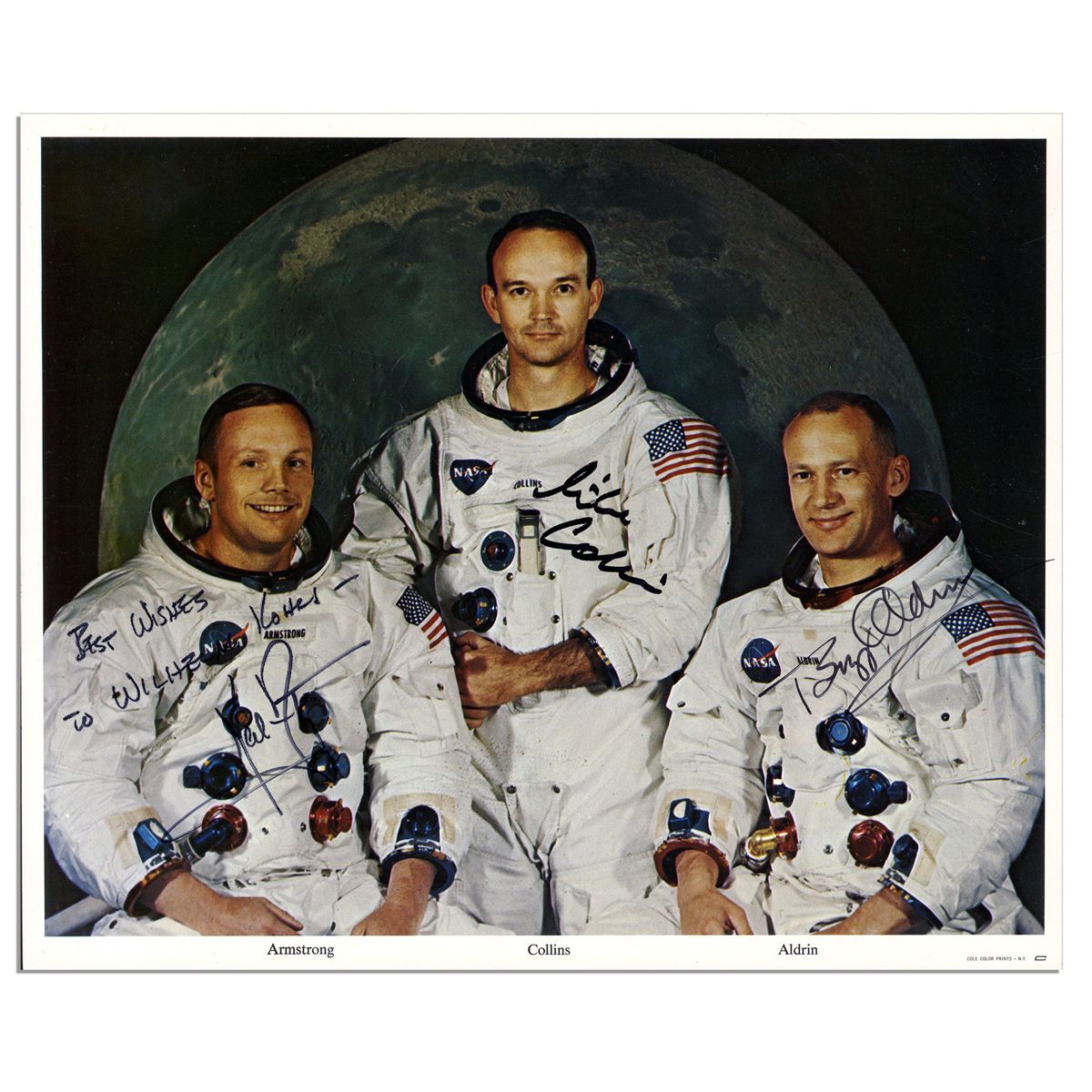 Apollo 11 crew signed official NASA photo. Smiling astronauts Neil Armstrong, Buzz Aldrin and Michael Collins each sign their spacesuits: ''Neil Armstrong'', ''Mike Collins'' and ''Buzz Aldrin''. Armstrong hand writes a dedication above his signature, ''Best wishes to Wilhelm Kohes''. Measures 10'' x 8''. Very good.