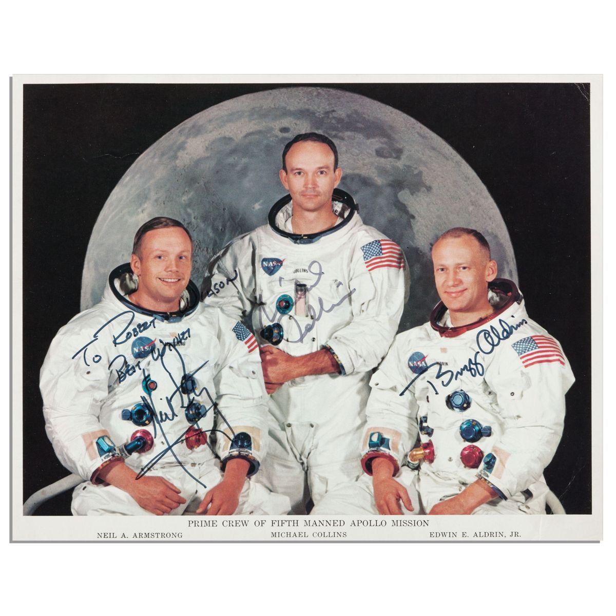 Apollo 11 crew photo signed by Neil Armstrong, Buzz Aldrin and Michael Collins. The astronauts each sign their spacesuits, ''Neil Armstrong'', ''Michael Collins'' and ''Buzz Aldrin'' in felt tip. An inscription by Armstrong reads, ''To Robert Wilson / Best Wishes''. Semi-matte photo measures 10'' x 8''. Some creasing, else near fine.