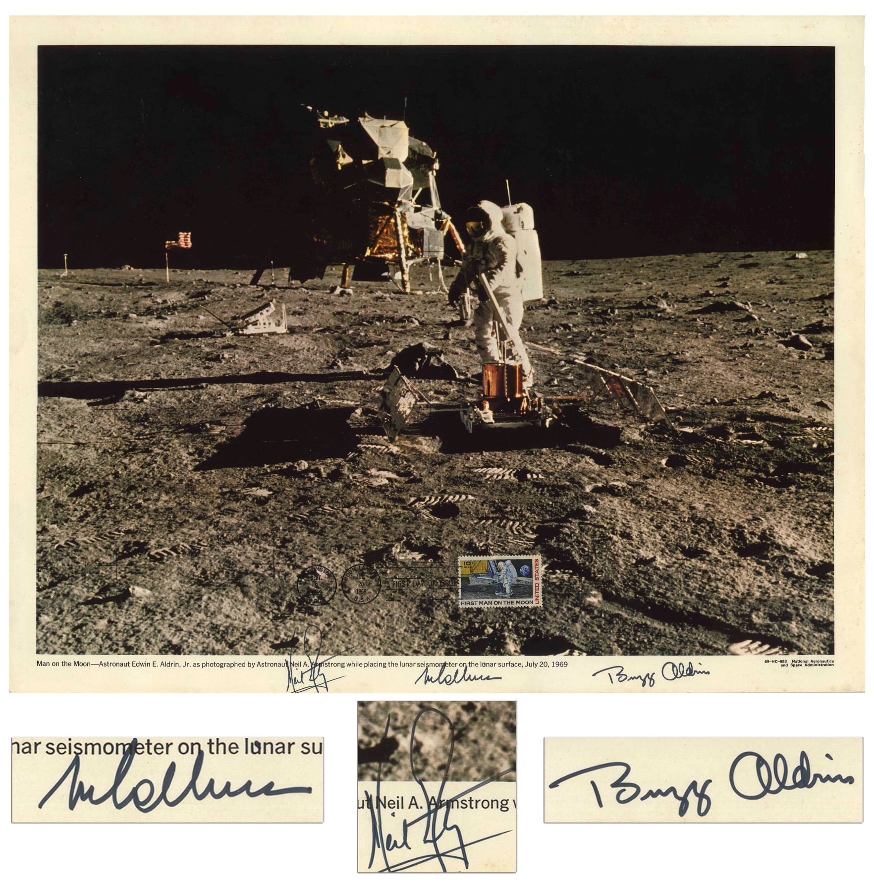 Apollo 11 crew signed lithograph measuring 20'' x 16'', with bold, uninscribed autographs by Neil Armstrong, Michael Collins and Buzz Aldrin. Photograph shows Buzz Aldrin, as captured by Neil Armstrong, placing the lunar seismometer on the moon's surface. With ''First Man on the Moon'' stamp and postal cancellations dated 20 July 1969, the day of the moon landing, and 9 September 1969, the day the stamp was issued. Very minute foxing on margin and a small bit of edgewear, overall in very good to near fine condition. One of the largest, finest Apollo 11 crew signed photos available.