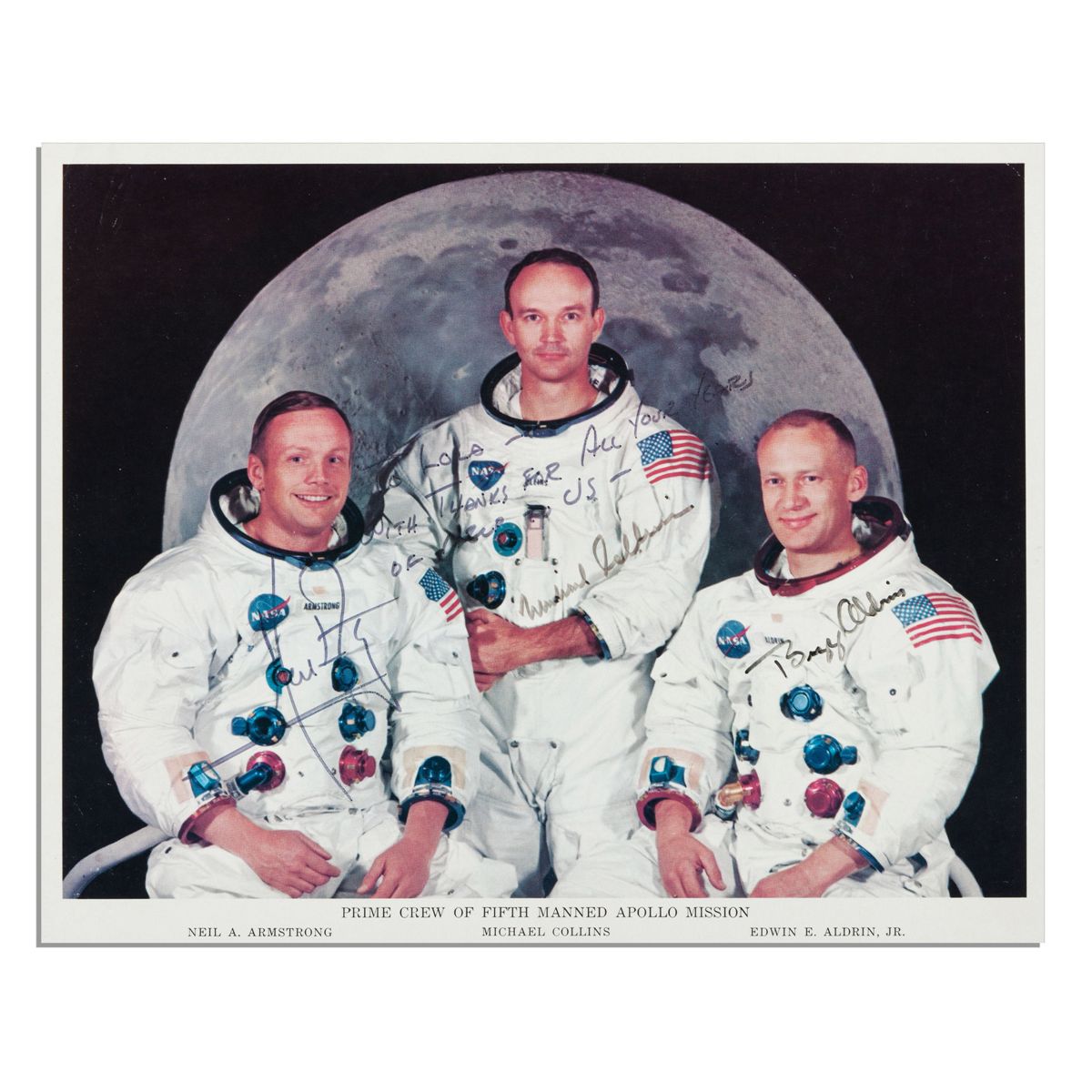 Apollo 11 crew photo signed by Neil Armstrong, Buzz Aldrin and Michael Collins. Classic image of the trio suited up for space travel is inscribed by Armstrong in blue felt tip, ''To Lola - With Thanks for All Your Years of Help to Us - / Neil Armstrong'' and signed by ''Michael Collins'' and ''Buzz Aldrin'' in black felt tip. Lola Morrow was chosen to be the first secretary of the new astronaut office in the early 1960's. Semi-matte photo measures 10'' x 8''. Paperclip indentation to upper left and minor creasing to upper right, else near fine.