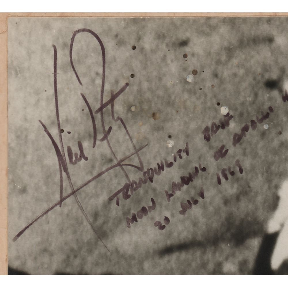 Very few photos of Neil Armstrong on the moon exist, as he was the chief photographer during the Apollo 11 EVAs-this remarkable image was taken by the 16mm Data Acquisition Camera that was mounted inside the Lunar Module. It is one of the iconic photographs of the 20th century, captured at the mission's triumphant climax when the stars and stripes were first unfurled on another celestial body. Armstrong's uncommon inclusion of the time and place, added below his signature, make it even more remarkable.