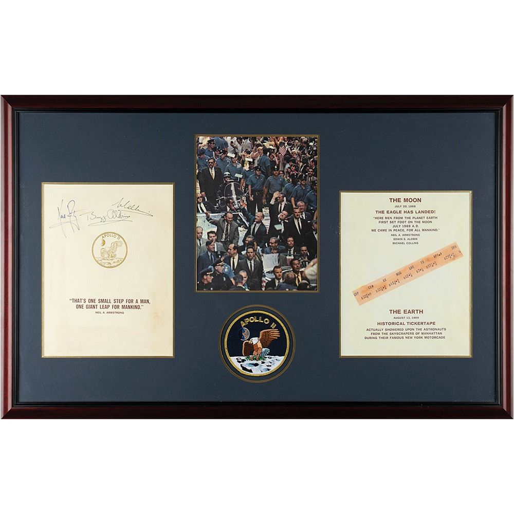 Unique souvenir folder imprinted with Neil Armstrong's famous quote and the Apollo 11 insignia, 8 x 10.5, signed in black felt tip by the entire crew of the first lunar landing: "Neil Armstrong," "Buzz Aldrin," and "M. Collins." Inside the folder is an affixed swatch of the "tickertape actually showered upon the astronauts from the skyscrapers of Manhattan during their famous New York motorcade," which took place on August 13, 1969. The folder is handsomely matted and framed with a color copy of its contents, an image of the parade, and an embroidered Apollo 11 mission patch to an overall size of 32 x 20. In fine condition, with faint toning and some light staining.