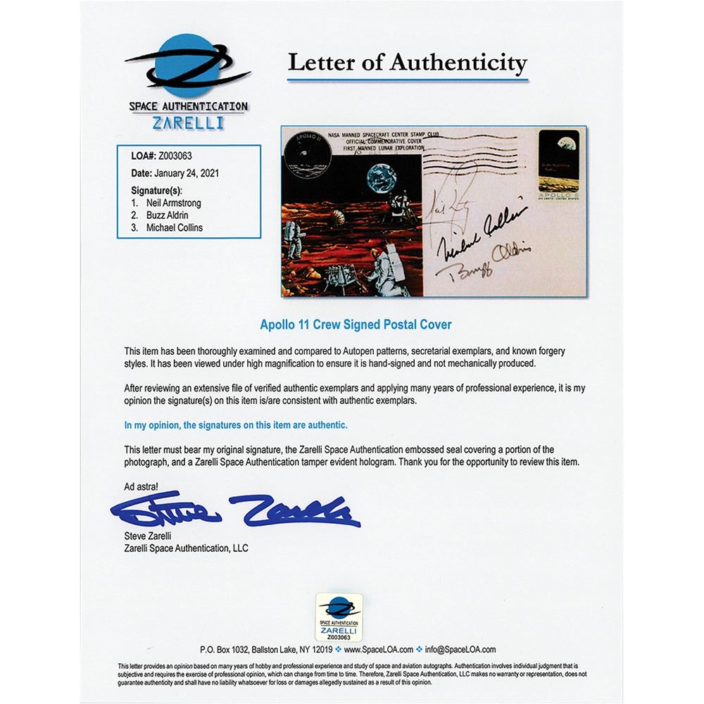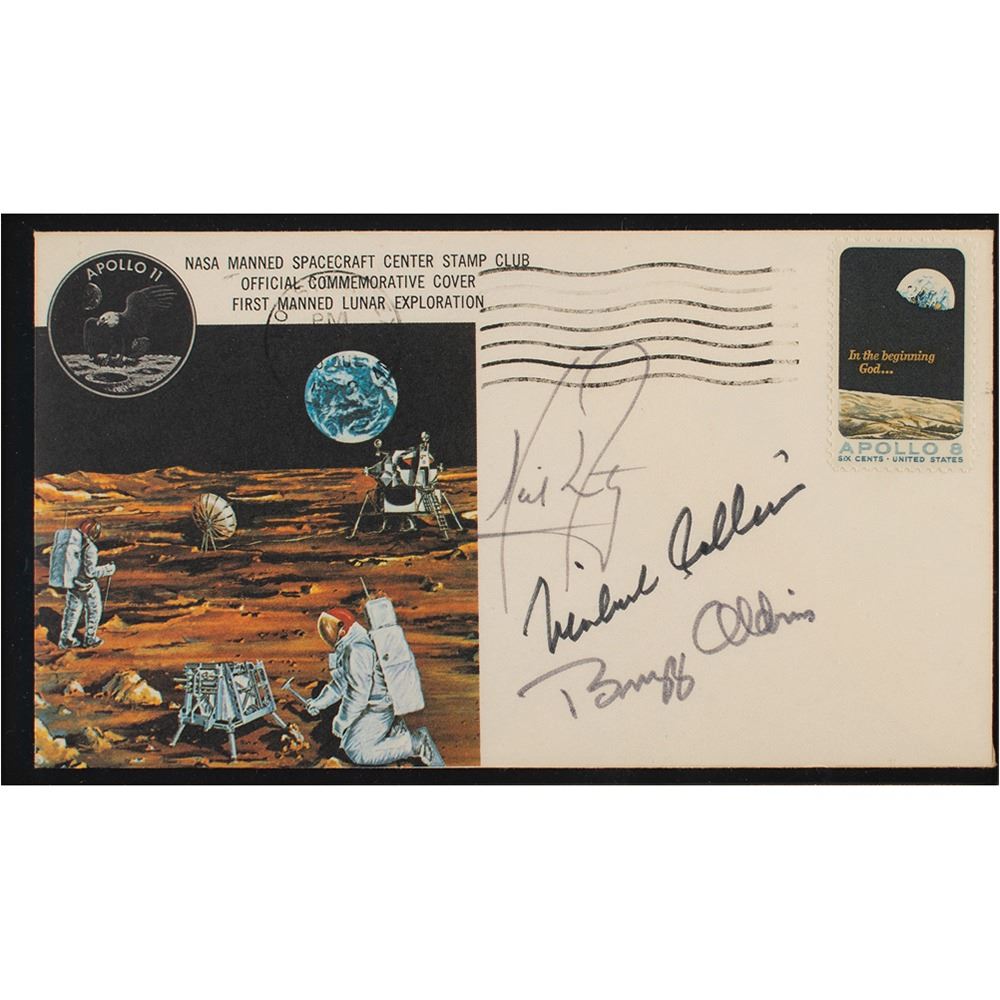 Immensely desirable Apollo 11 ‘Type 1' insurance cover with a color cachet of lunar surface activities, postmarked at Houston on July 20, 1969, the moon landing date of the Lunar Module Eagle, signed in black felt tip prior to launch by Neil Armstrong, Michael Collins, and Buzz Aldrin. These historic covers were flown to Houston after launch for cancellation by Apollo 10 Commander Tom Stafford in his T-38 jet. In very fine condition. Encapsulated in a PSA/DNA authentication holder. The famous insurance covers, first produced for Apollo 11, were to provide financial security for astronauts' families in case of disaster. They have earned near-legendary status as the ultimate space-related philatelic item and one of the most sought-after formats for astronaut autographs.
