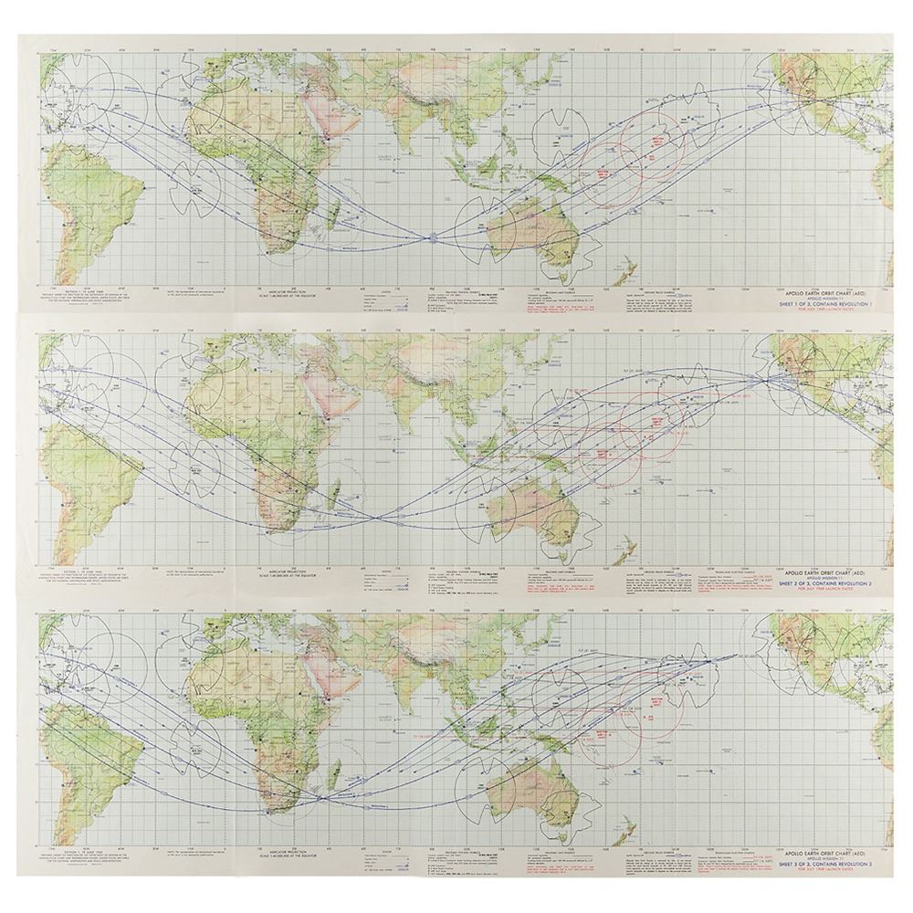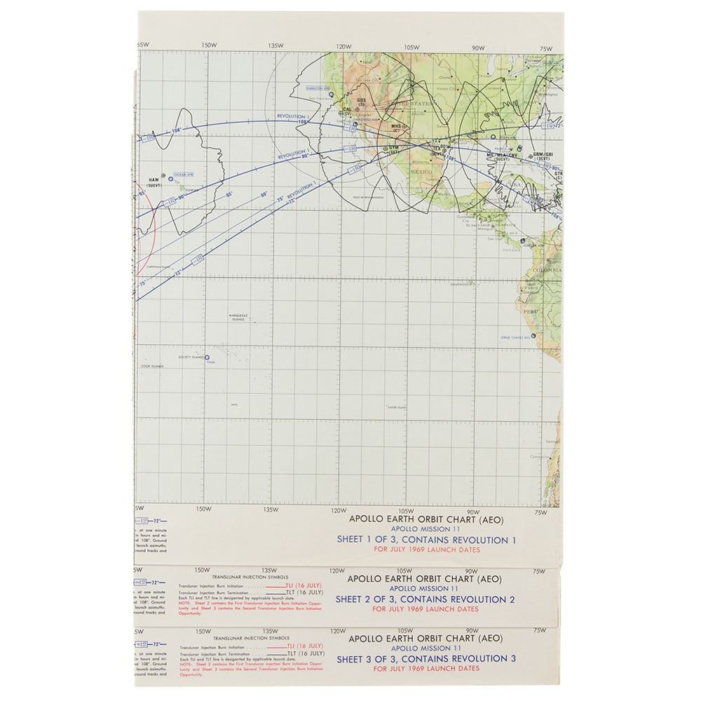 Set of three original first edition Apollo 11 Earth Orbit Charts, each 41.5 x 13.5, prepared for NASA under the direction of the Department of Defense by the Aeronautical Chart and Information Center, dated June 19, 1969. Charts outline the first three orbits around the Earth by the Apollo 11 spacecraft and are labeled in the lower right, "Apollo Earth Orbit Chart (AEO), Apollo Mission 11‰Û_For July 1969 Launch Dates." Folded and in fine condition, with a few wrinkles.